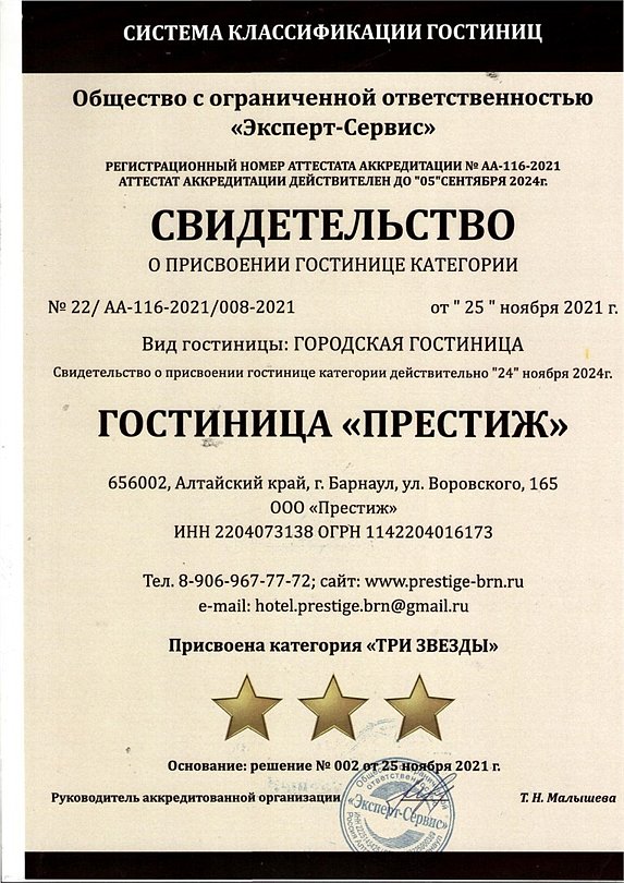Отель «Престиж» находится в 2 км от центра Барнаула в тихом месте. Непосредственная близость к центру позволяет снять номер для осмотра достопримечательностей и организации деловых мероприятий. Ж/д вокзал отдален от зоны корпуса на 3 км, до аэропорта 20 мин. на автомобиле.