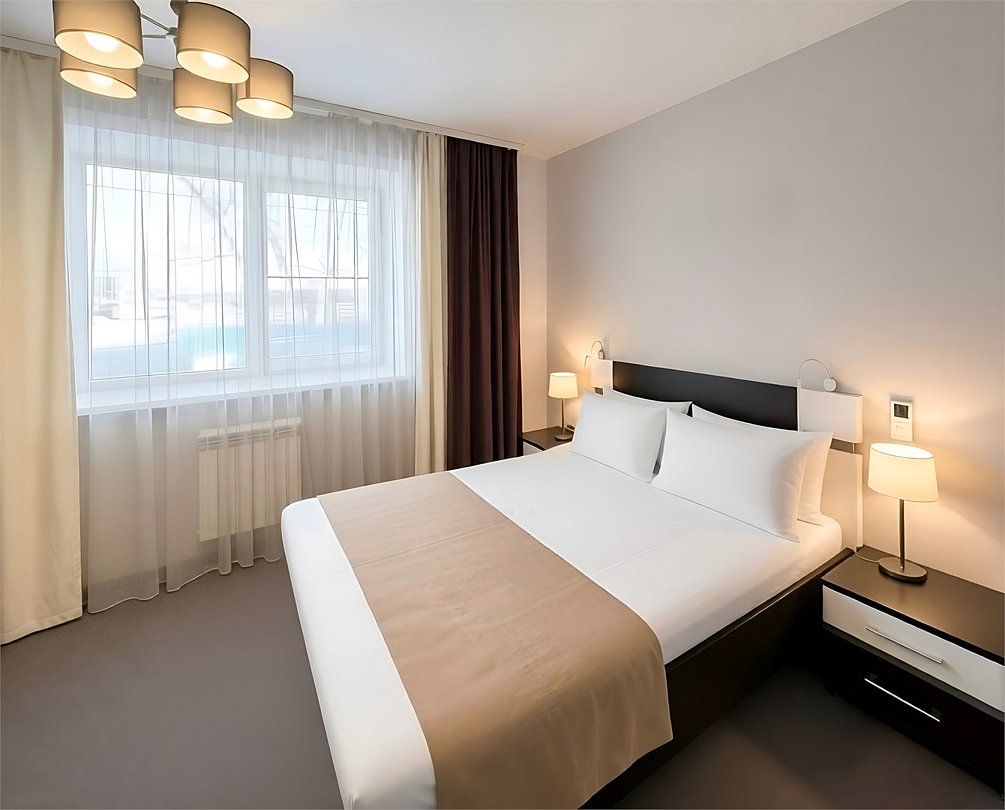 Номерной фонд состоит из двухместных Люксов и Стандартов, рассчитанных на 1-2 человек. Всего гостиница способна разместить 133 постояльцев. Интерьер спален выполнен в спокойном, нейтральном стиле, располагающем к отдыху. В комнатах есть удобная мебель, телевизоры, электрочайники. В номерах Люкс есть собственная кухня с микроволновой печью, холодильником и набором посуды.