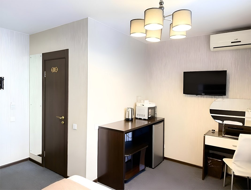телевизор, кабельное телевидение, Wi-Fi, интернет, холодильник, кондиционер, фен, электронные замки, душевая кабина, ванна или душевая кабина, санузел, водонагреватель, теплый пол, халаты, банные полотенца, тапочки, косметические средства, балкон, кровать «King size», гипоаллергенное белье, ортопедический матрас, тумбы, стулья, шкаф для одежды, вешалки, журнальный столик, письменный стол, зеркало, звуконепроницаемые стены и окна, мини-бар, письменные принадлежности, свежая пресса, набор посуды, обслуживание номеров, информационная карта, меню, унитаз, раковина, питьевая вода, ковровое покрытие, отопление, душ, кулер на этаже, стул, тумба, туалетный столик, туалет, гостиничная парфюмерия, телевизор со Smart TV, без питомцевВ гостиничном номере