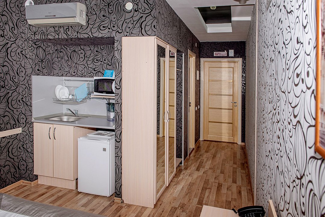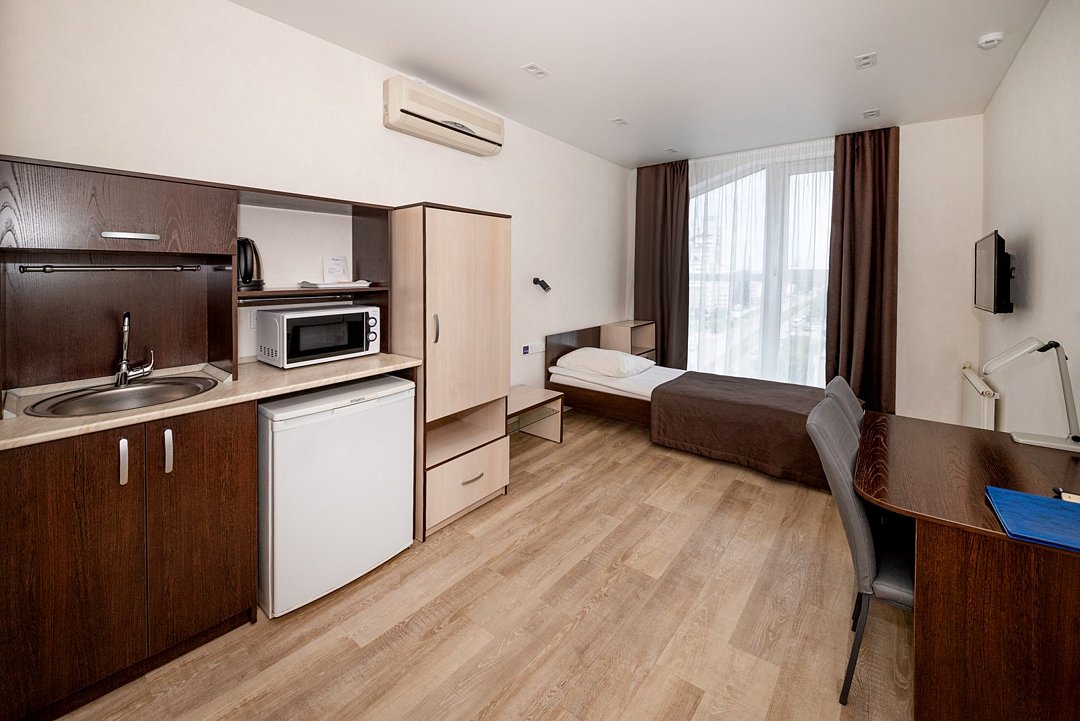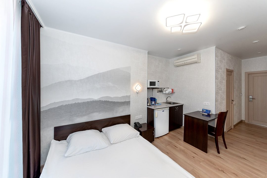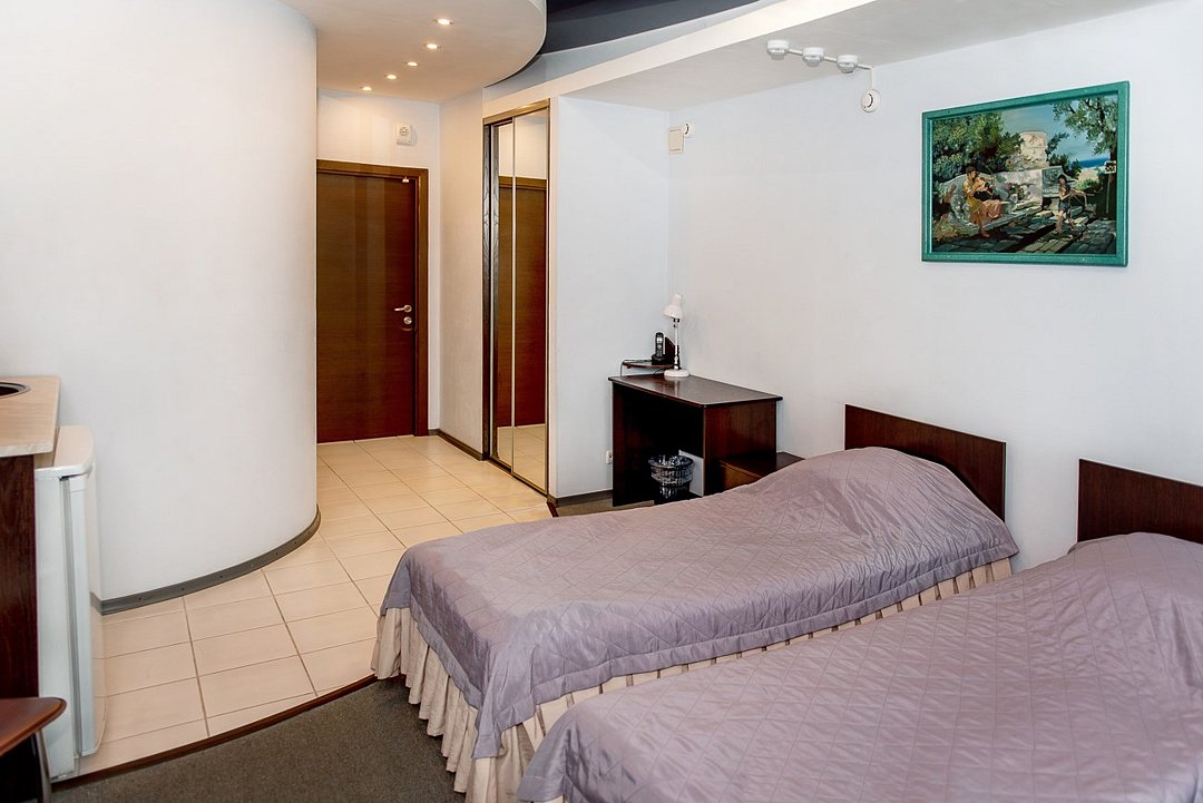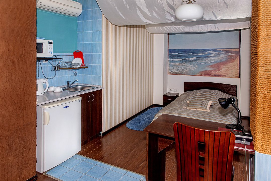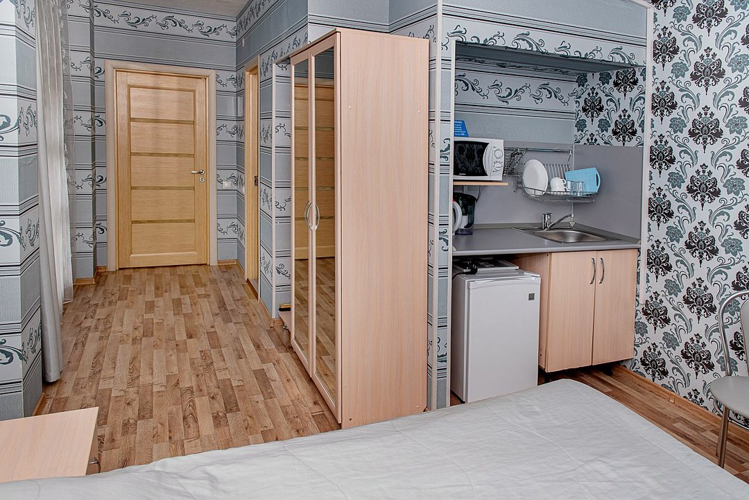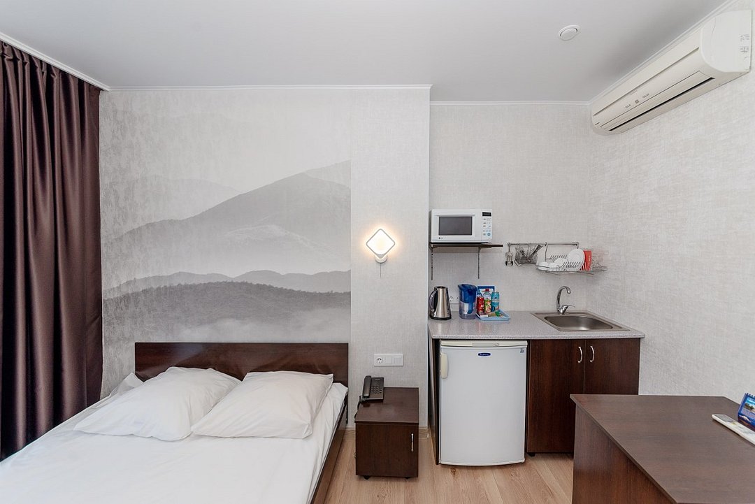 Одна комната (19 м.кв), одна кровать (120х200 см), кондиционер, телевизор (d 54 см), кабельное телевидение, интернет (Wi-Fi), телефон, журнальный столик, стулья. Щетка для обуви, щетка для одежды. Мини-кухня: посуда, холодильник, СВЧ-печь, электрочайник, фильтр для воды. Ванная комната: душевая кабина, биде, парфюмерно-косметические изделия.Услуги и удобства