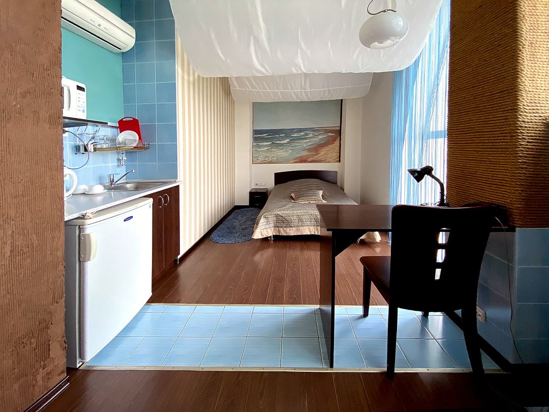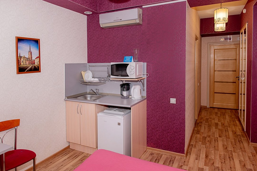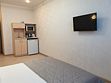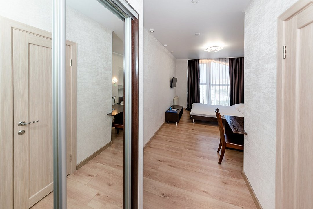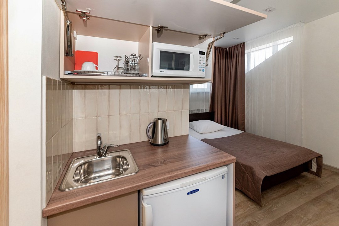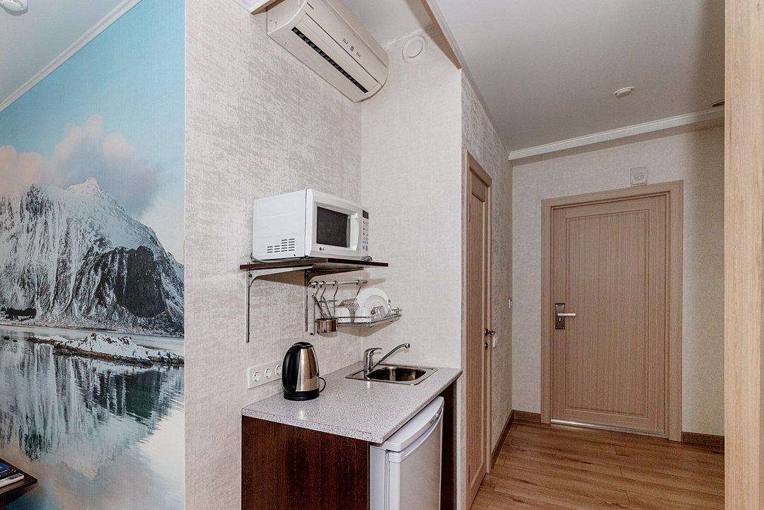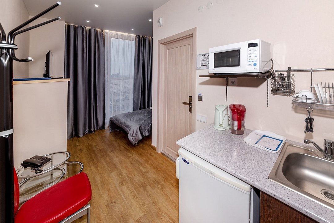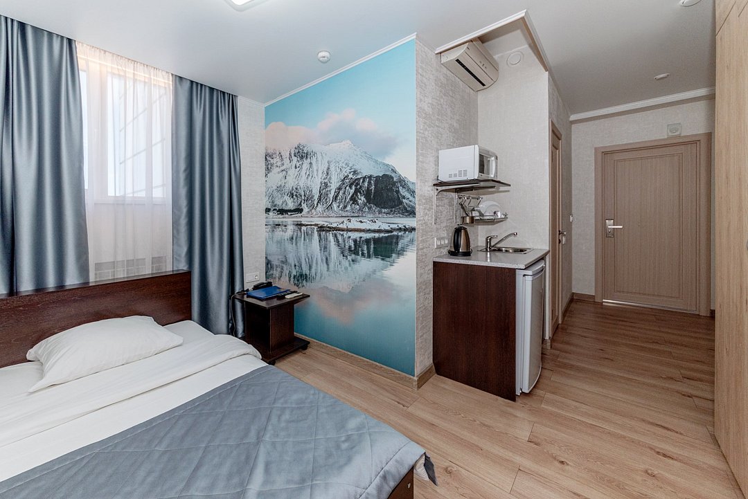 Одна комната (19 м.кв), одна кровать (120х200 см), кондиционер, телевизор (d 54 см), кабельное телевидение, интернет (Wi-Fi), телефон, журнальный столик, стулья. Щетка для обуви, щетка для одежды. Мини-кухня: посуда, холодильник, СВЧ-печь, электрочайник, фильтр для воды. Ванная комната: душевая кабина, биде, парфюмерно-косметические изделия.Услуги и удобства