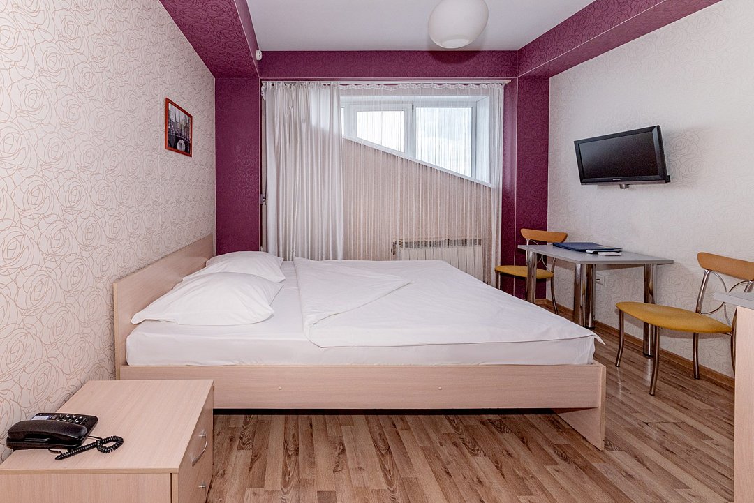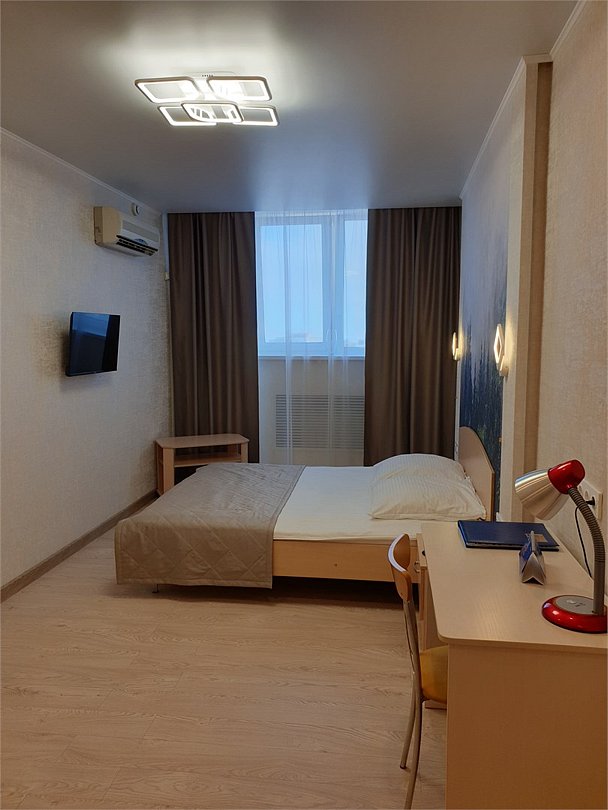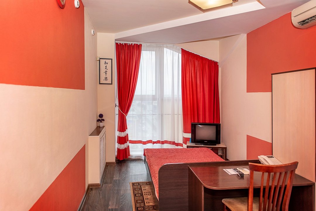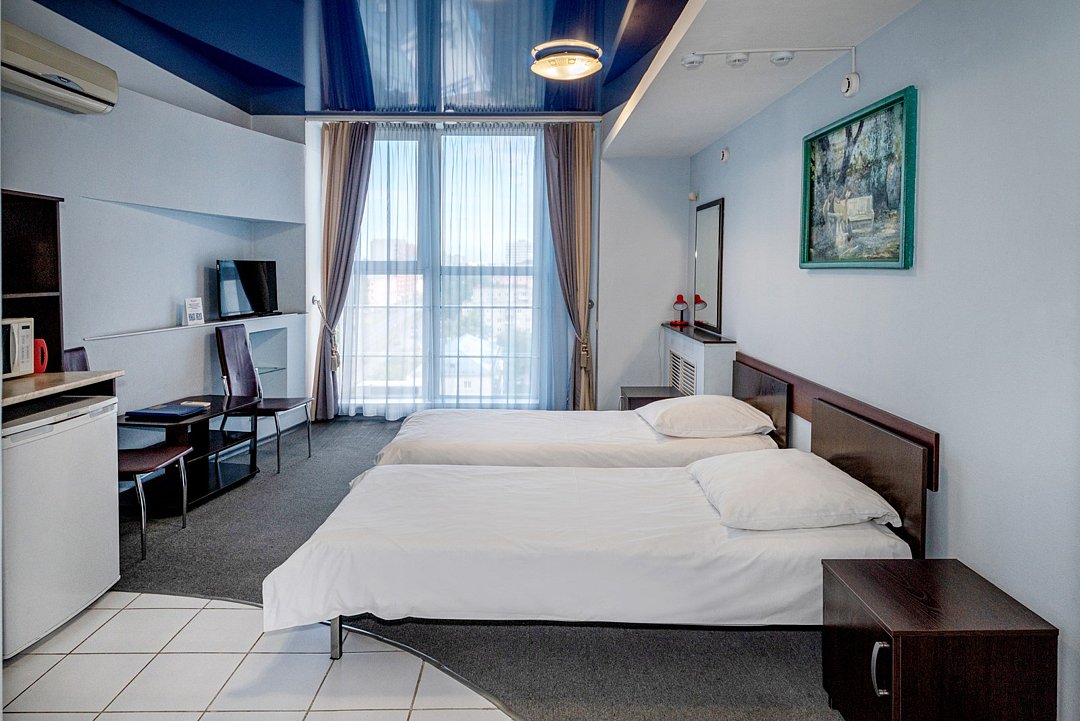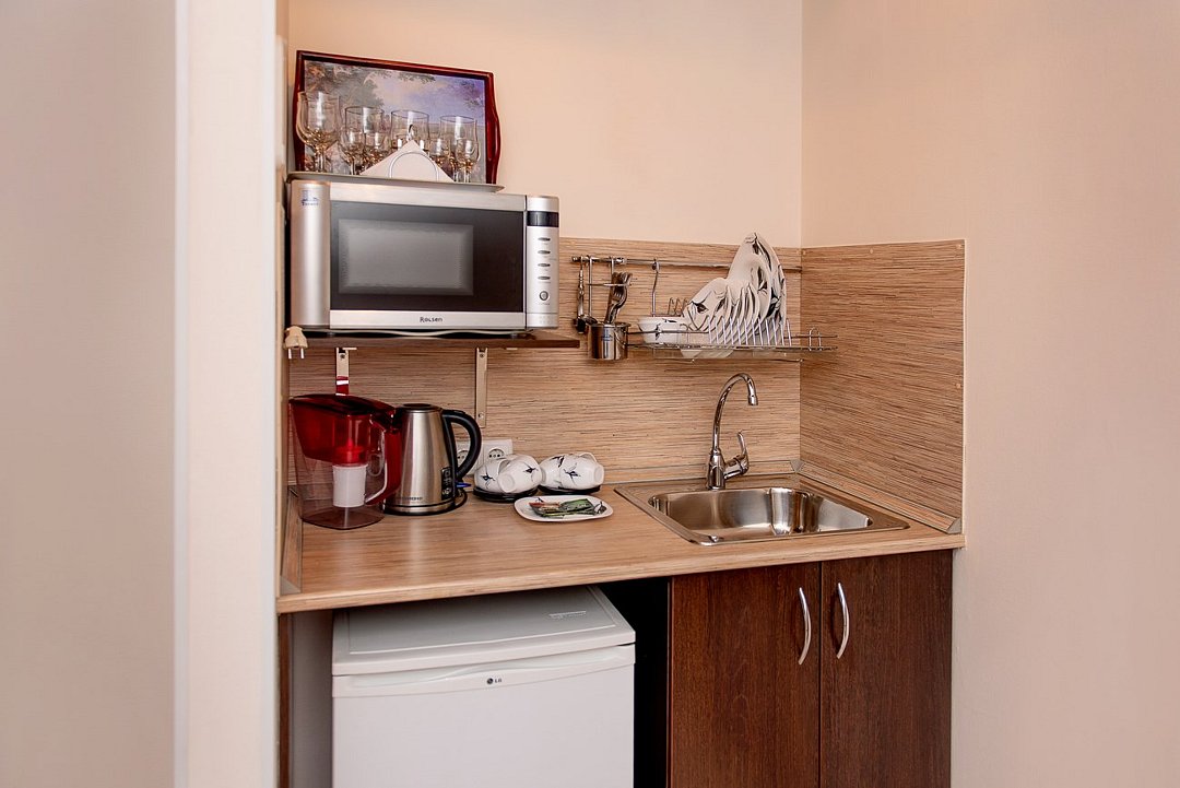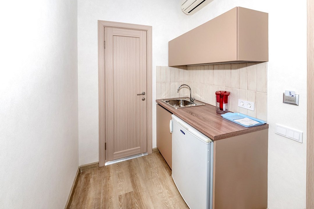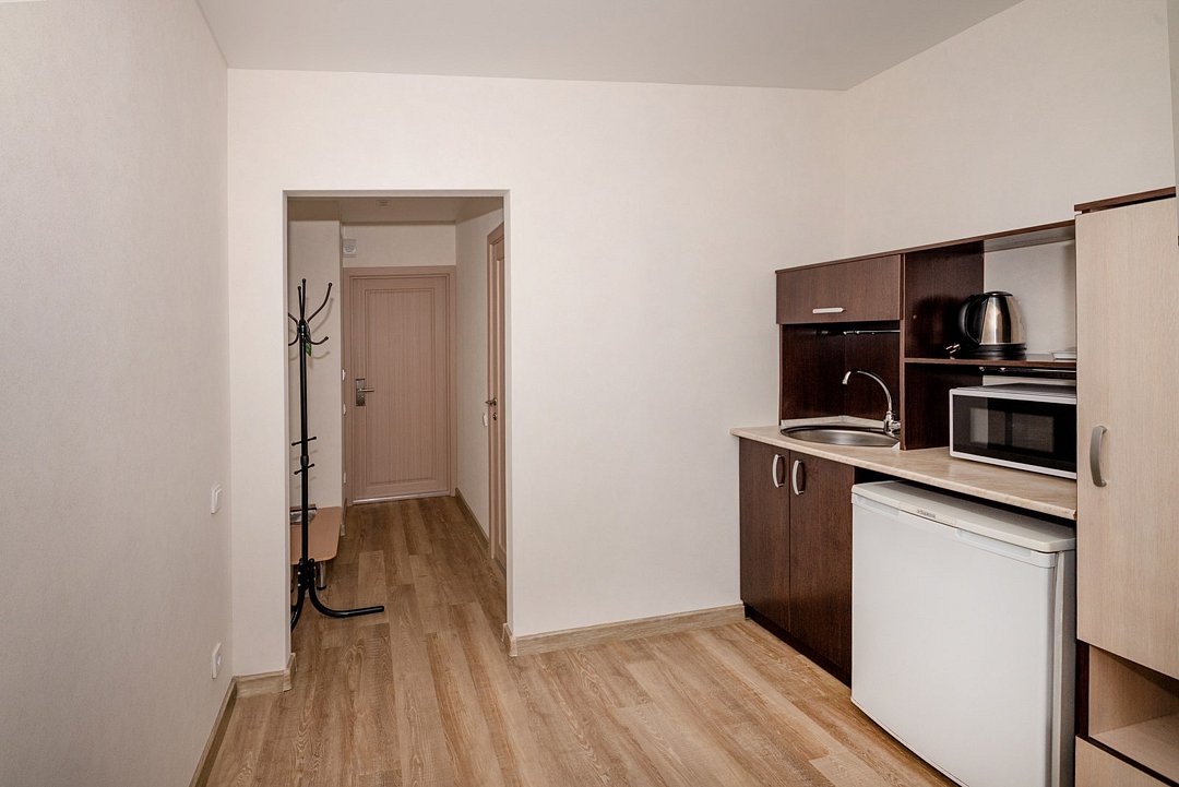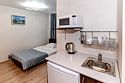 Одна комната (19 м.кв), одна кровать (120х200 см), кондиционер, телевизор (d 54 см), кабельное телевидение, интернет (Wi-Fi), телефон, журнальный столик, стулья. Щетка для обуви, щетка для одежды. Мини-кухня: посуда, холодильник, СВЧ-печь, электрочайник, фильтр для воды. Ванная комната: душевая кабина, биде, парфюмерно-косметические изделия.Услуги и удобства
