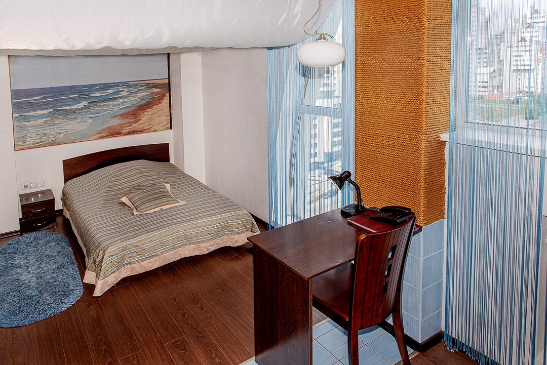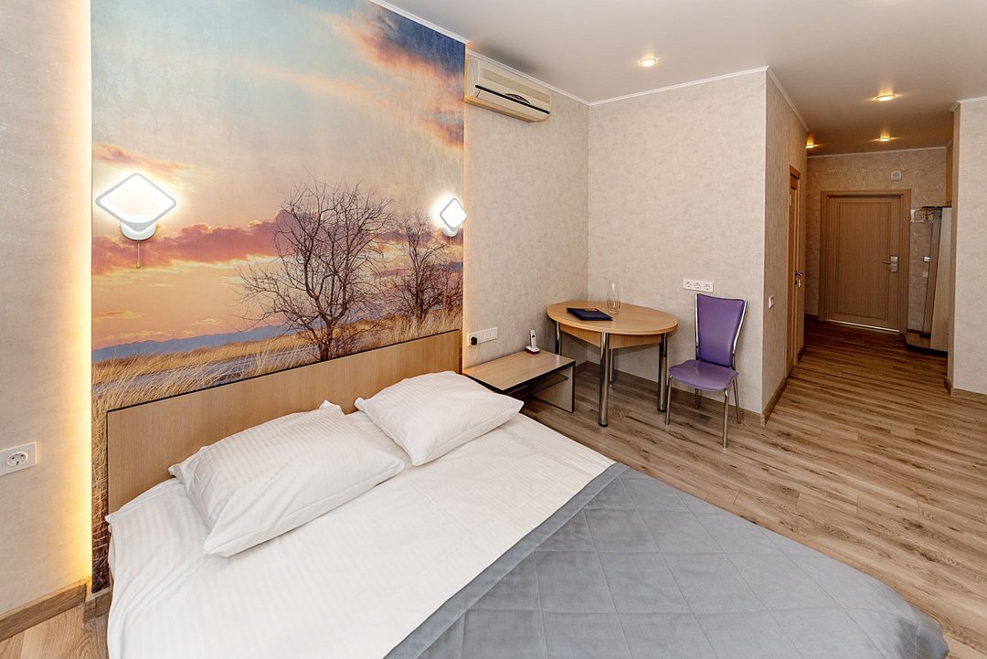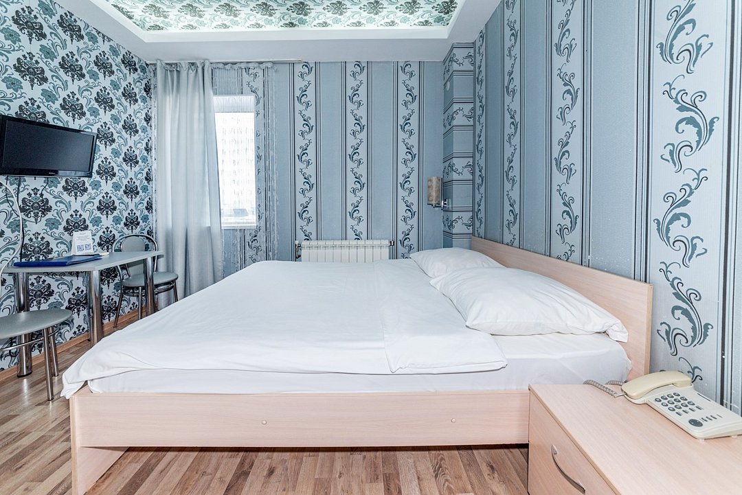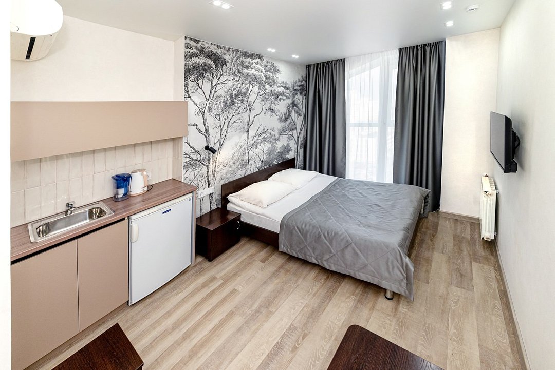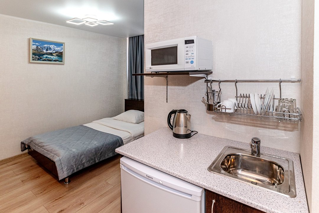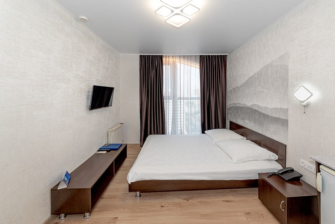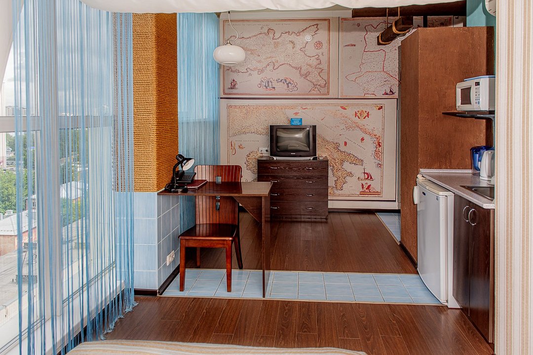 Одна комната (19 м.кв), одна кровать (120х200 см), кондиционер, телевизор (d 54 см), кабельное телевидение, интернет (Wi-Fi), телефон, журнальный столик, стулья. Щетка для обуви, щетка для одежды. Мини-кухня: посуда, холодильник, СВЧ-печь, электрочайник, фильтр для воды. Ванная комната: душевая кабина, биде, парфюмерно-косметические изделия.Услуги и удобства