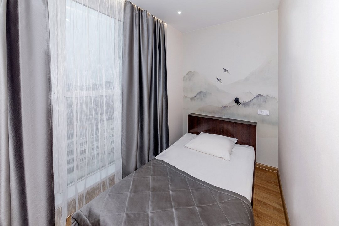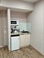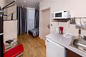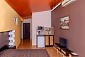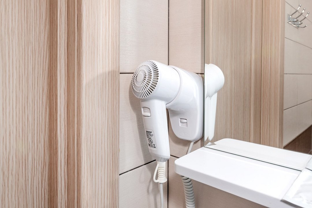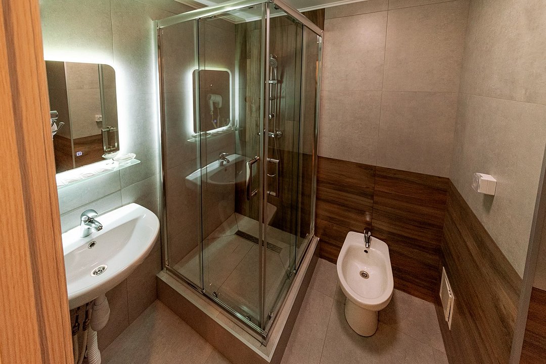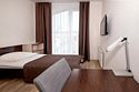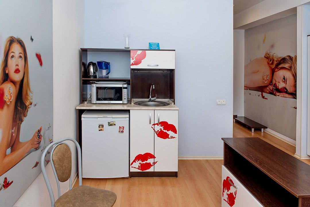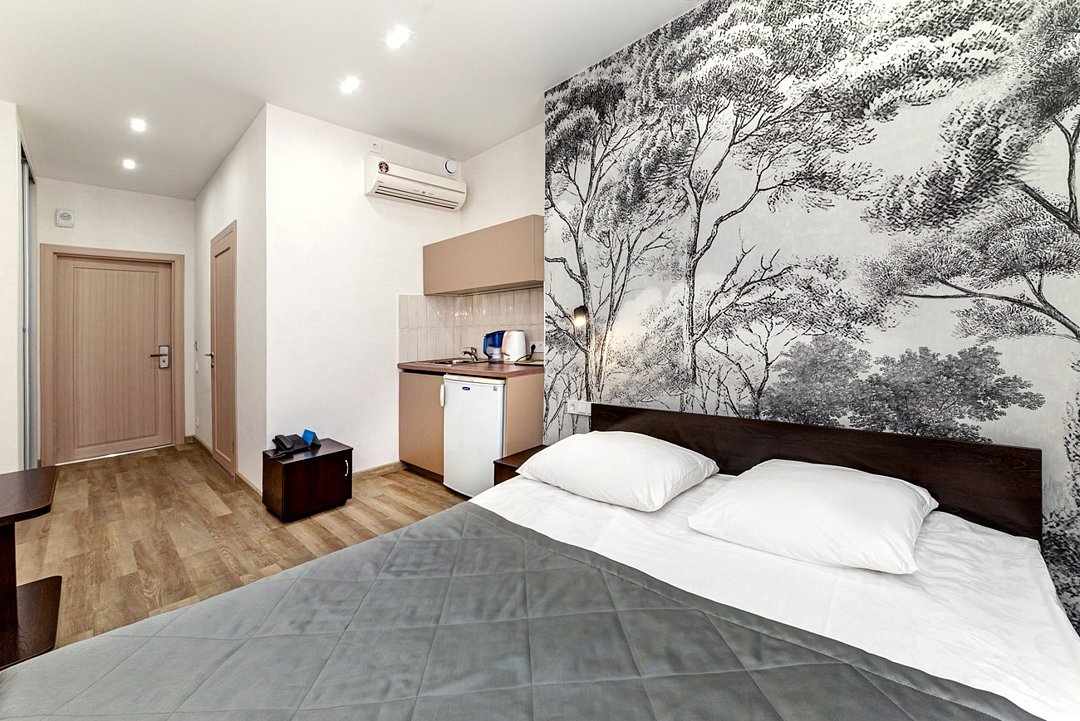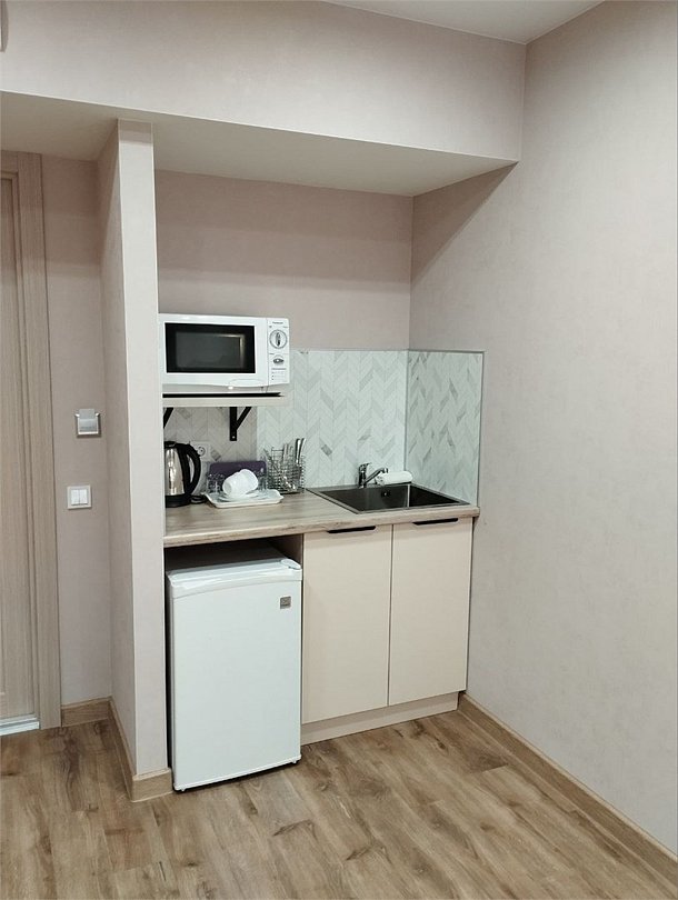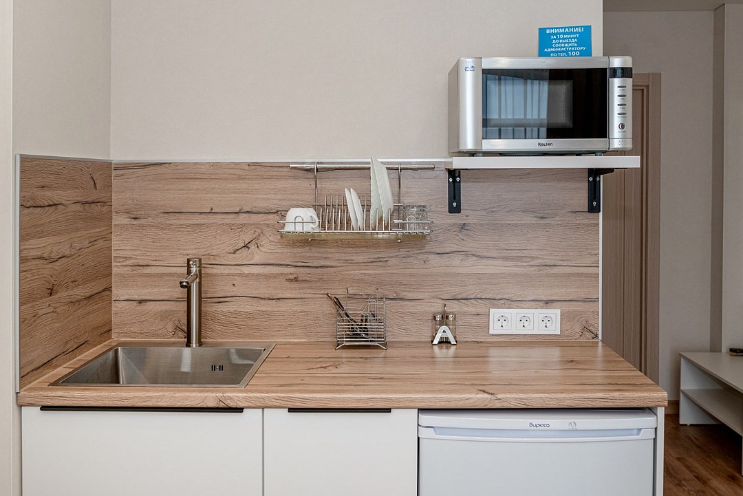 Одна комната (19 м.кв), одна кровать (120х200 см), кондиционер, телевизор (d 54 см), кабельное телевидение, интернет (Wi-Fi), телефон, журнальный столик, стулья. Щетка для обуви, щетка для одежды. Мини-кухня: посуда, холодильник, СВЧ-печь, электрочайник, фильтр для воды. Ванная комната: душевая кабина, биде, парфюмерно-косметические изделия.Услуги и удобства