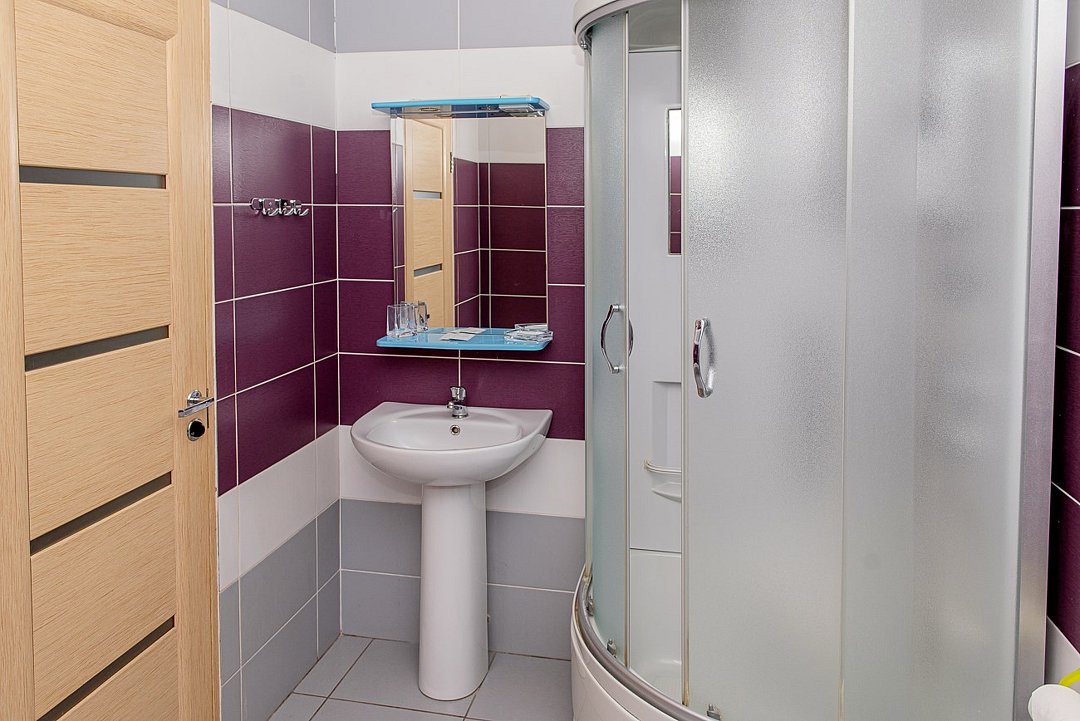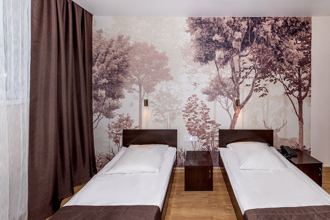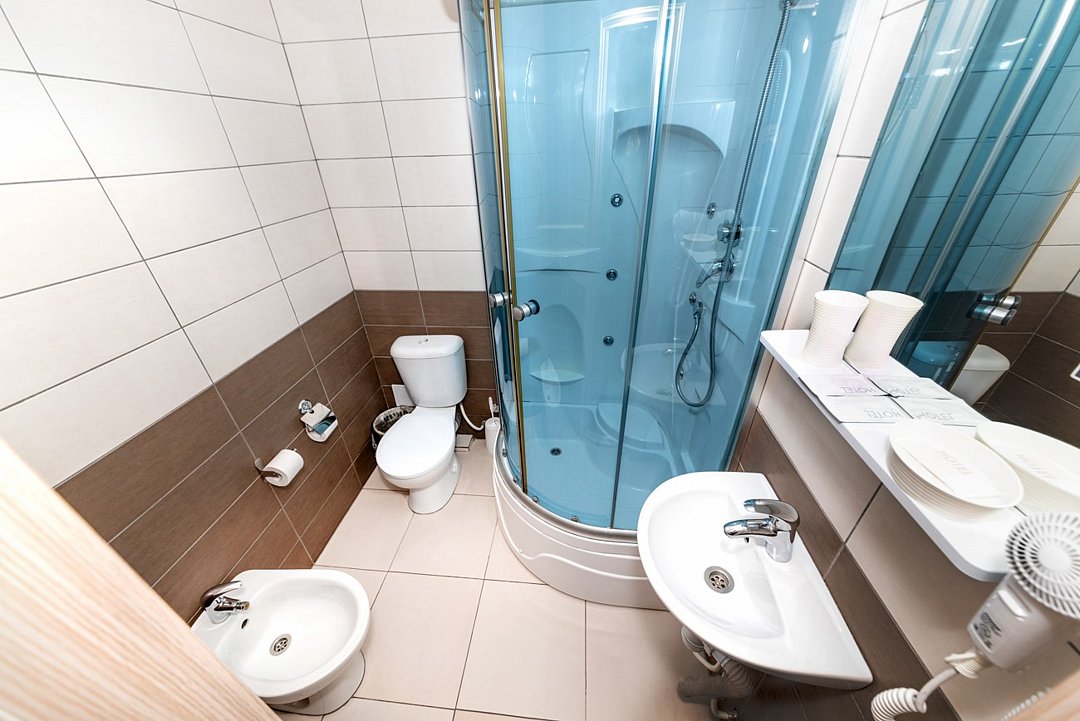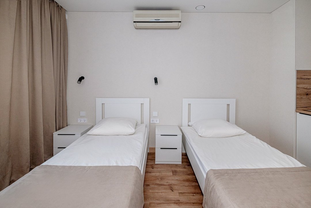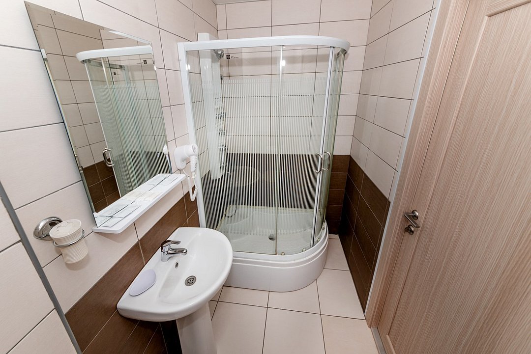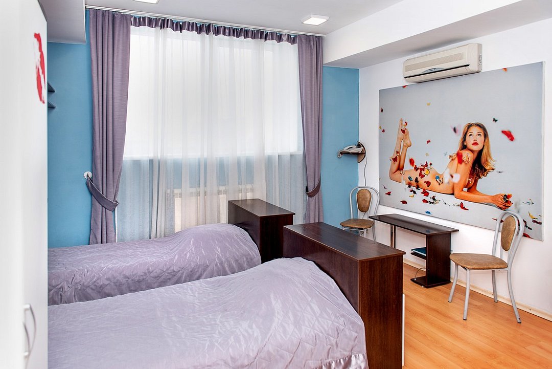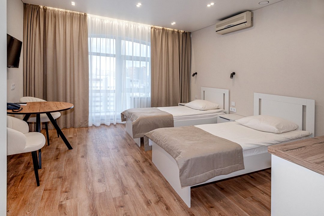 Двухместный номер "Модерн". «Модерн» – идеален для людей, любящих неординарность и элегантную простоту интерьера. Дизайн интерьера основан в первую очередь на удобстве проживания, но вместе с тем может принести настоящее эстетическое наслаждение проживающим в этом номере – настолько хорошо в нем все продумано и красиво, от мебели и текстиля. Одна комната (22 м.кв): две кровати. (90х200 см), телевизор (d 54 см), кабельное телевидение, интернет (Wi-Fi), телефон, кондиционер. Щетка для обуви, щетка для одежды. Мини-кухня: посуда, холодильник, СВЧ-печь, электрочайник. Ванная комната: душевая кабина, парфюмерно-косметические изделия.Услуги и удобства