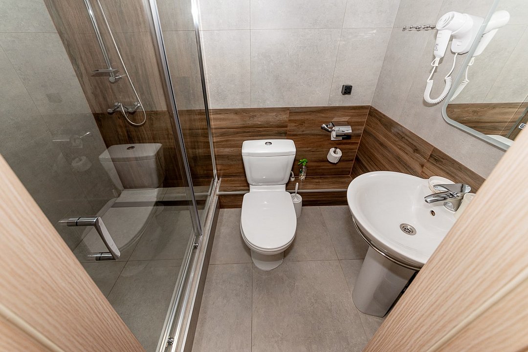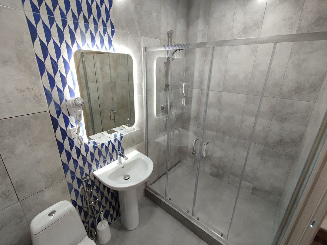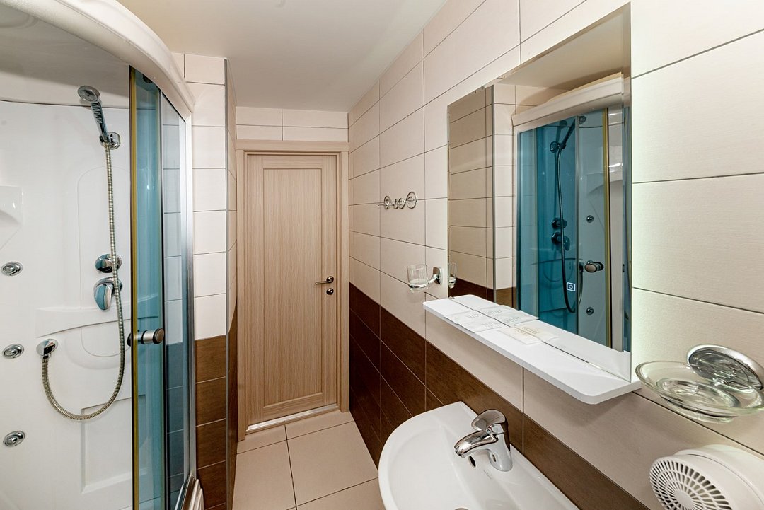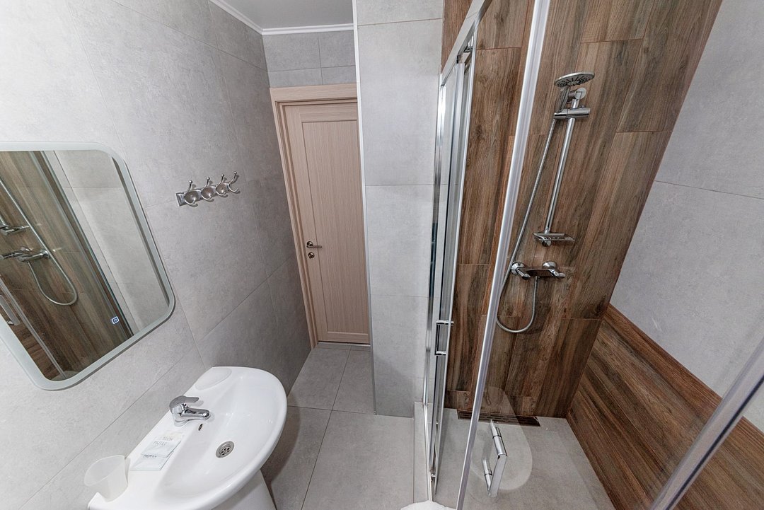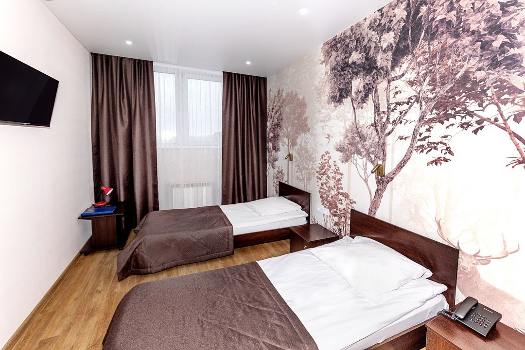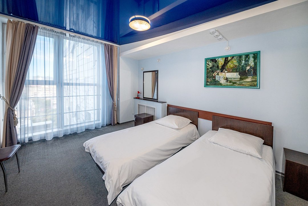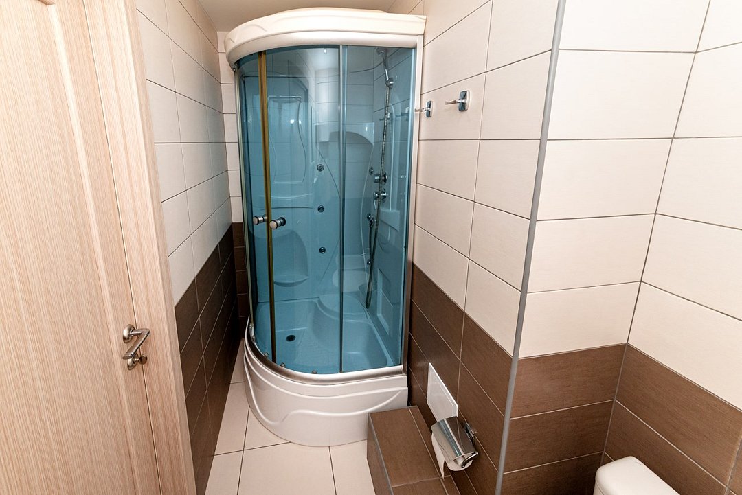Двухместный номер "Модерн". «Модерн» – идеален для людей, любящих неординарность и элегантную простоту интерьера. Дизайн интерьера основан в первую очередь на удобстве проживания, но вместе с тем может принести настоящее эстетическое наслаждение проживающим в этом номере – настолько хорошо в нем все продумано и красиво, от мебели и текстиля. Одна комната (22 м.кв): две кровати. (90х200 см), телевизор (d 54 см), кабельное телевидение, интернет (Wi-Fi), телефон, кондиционер. Щетка для обуви, щетка для одежды. Мини-кухня: посуда, холодильник, СВЧ-печь, электрочайник. Ванная комната: душевая кабина, парфюмерно-косметические изделия.Услуги и удобства