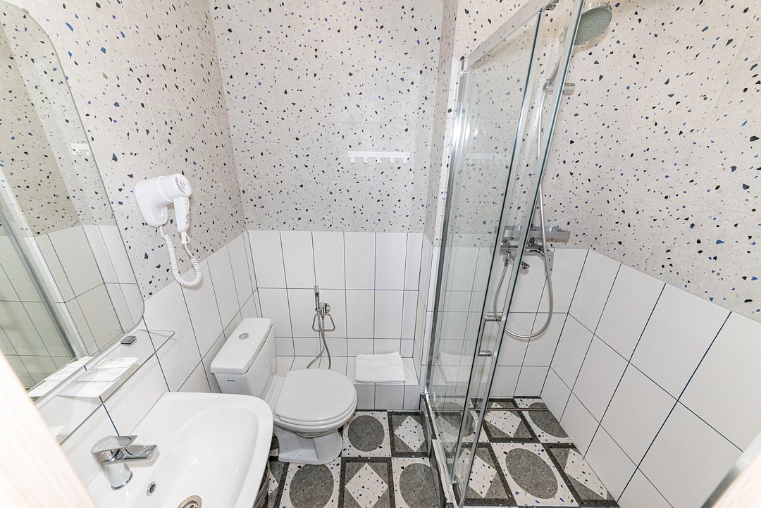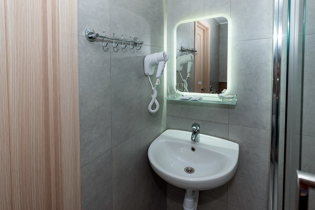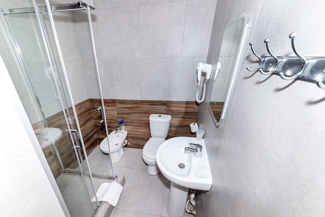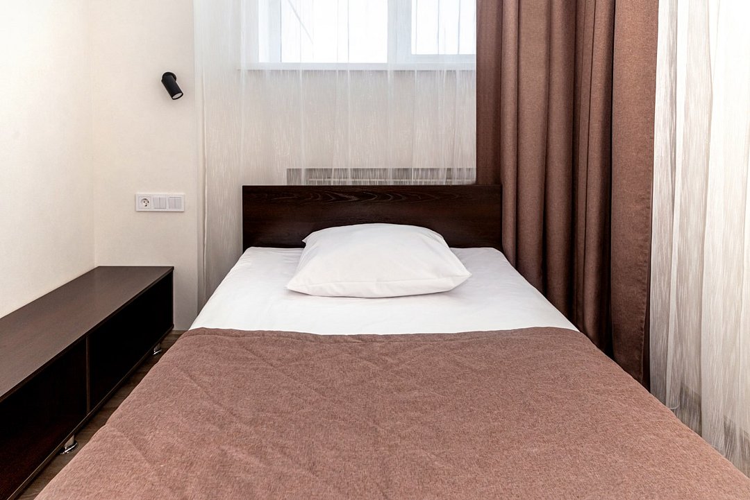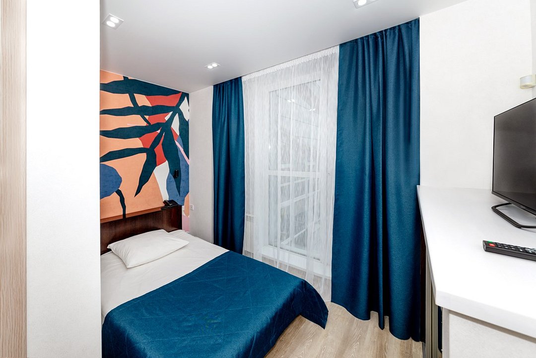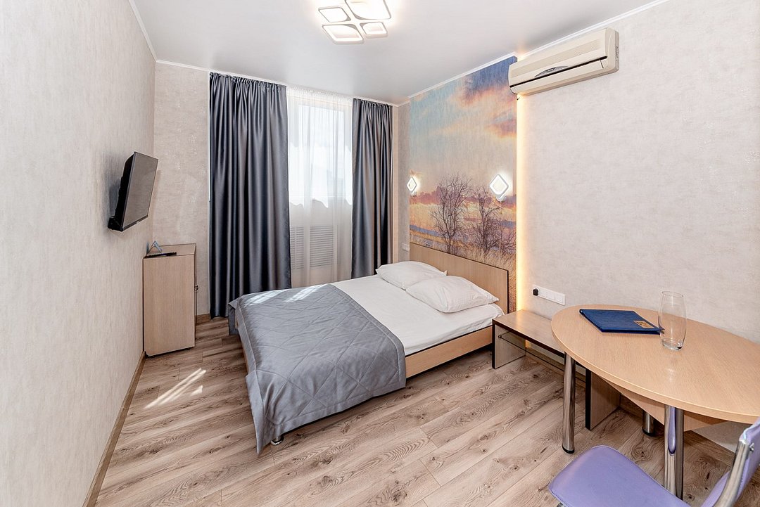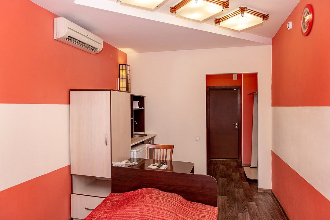 Это удобный одноместный номер – небольшой, но весьма функциональный. Одна комната (15 м.кв), одна кровать (120х200 см), кондиционер, телевизор (d 54 см), кабельное телевидение, интернет (Wi-Fi), телефон, журнальный столик, стулья. Щетка для обуви, щетка для одежды. Мини-кухня: посуда, холодильник, СВЧ-печь, электрочайник, фильтр для воды. Ванная комната: душевая кабина, биде, парфюмерно-косметические изделия.Услуги и удобства