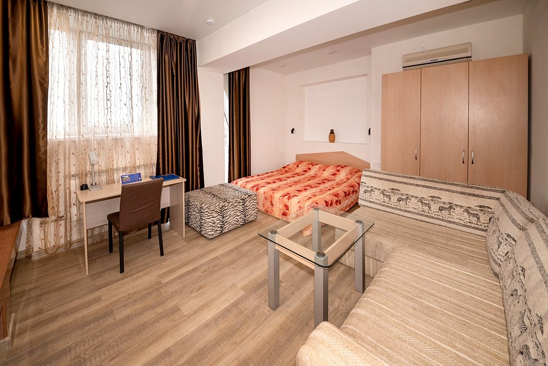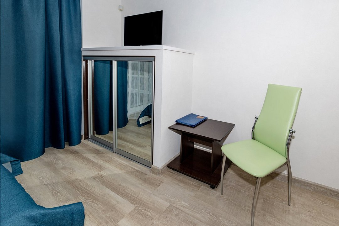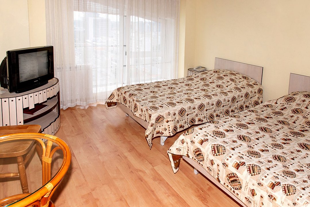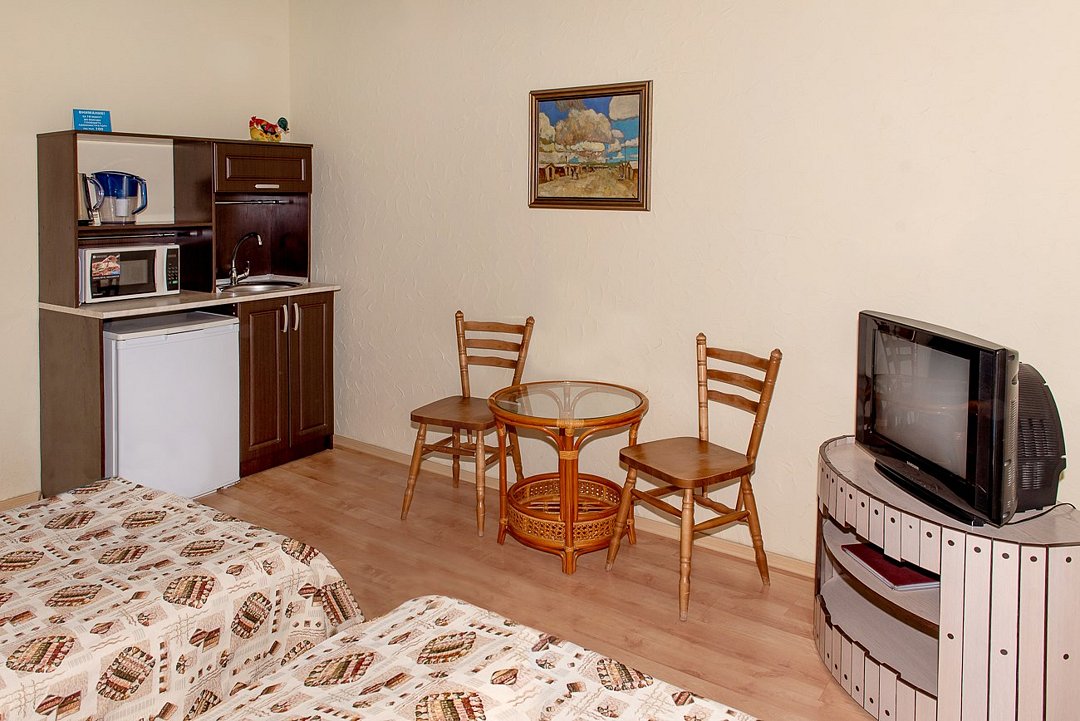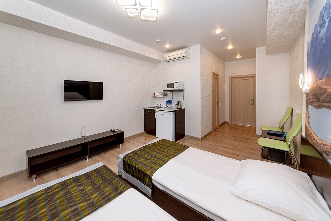 Одна комната (23 м.кв): две кровати (90х200 см), кондиционер, телевизор (d 54 см), кабельное телевидение, интернет (Wi-Fi), телефон, журнальный столик, стулья. Щетка для обуви, щетка для одежды. Мини-кухня: посуда, холодильник, СВЧ-печь электрочайник, фильтр для воды. Ванная комната: душевая кабина, биде, парфюмерно-косметические изделия.Услуги и удобства