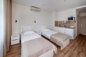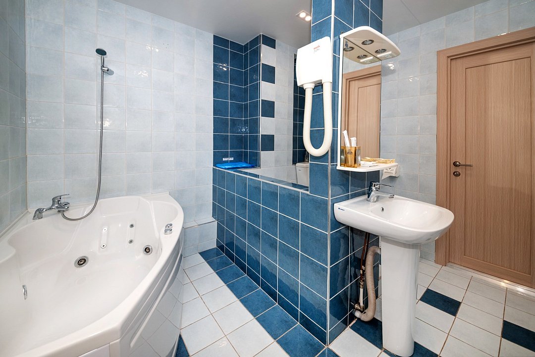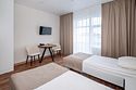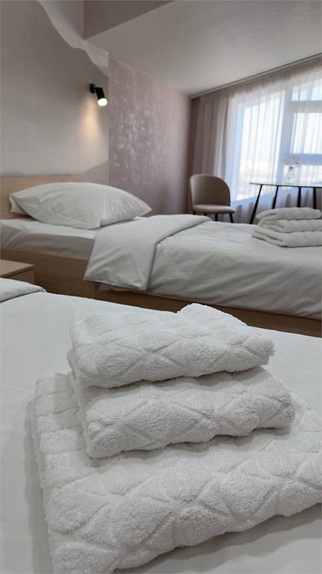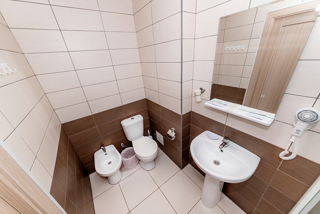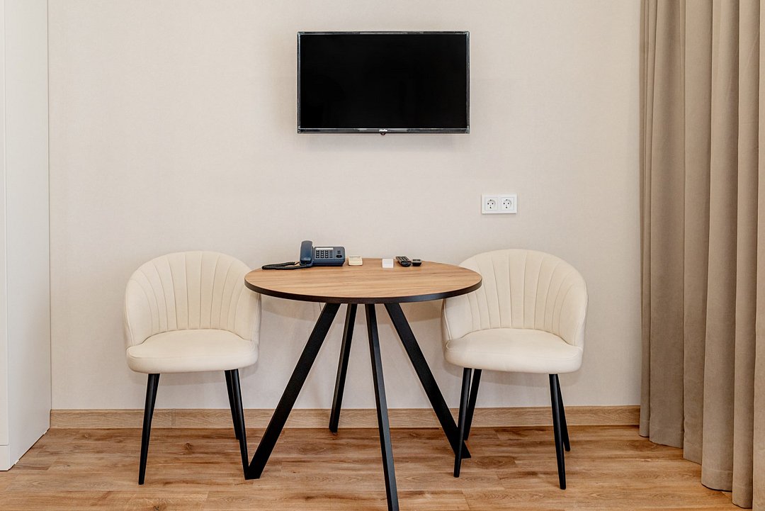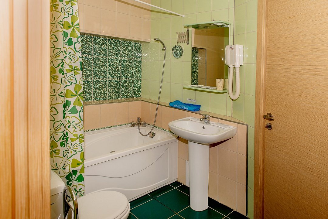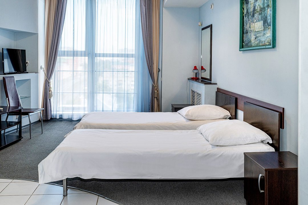 Одна комната (23 м.кв): две кровати (90х200 см), кондиционер, телевизор (d 54 см), кабельное телевидение, интернет (Wi-Fi), телефон, журнальный столик, стулья. Щетка для обуви, щетка для одежды. Мини-кухня: посуда, холодильник, СВЧ-печь электрочайник, фильтр для воды. Ванная комната: душевая кабина, биде, парфюмерно-косметические изделия.Услуги и удобства