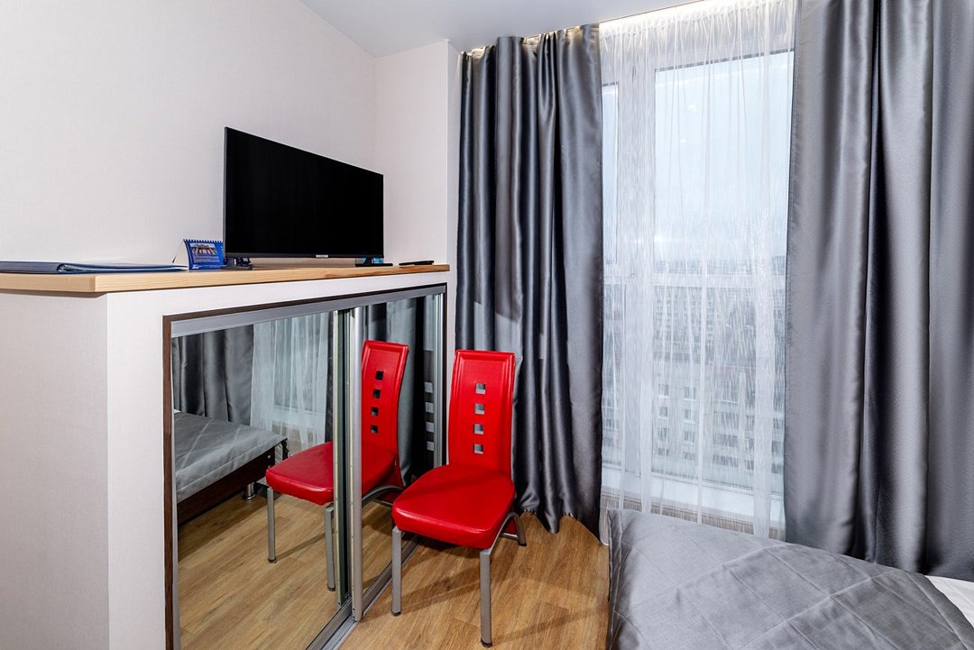 телевизор, Wi-Fi, интернет, холодильник, кондиционер, фен, душевая кабина, косметические средства, полутораспальная кровать, стулья, шкаф для одежды, мини-бар, набор посуды, обслуживание номеров, вид на город, туалетные средства, туалет, цифровое тв, мини-кухня, шкаф-купеВ номере