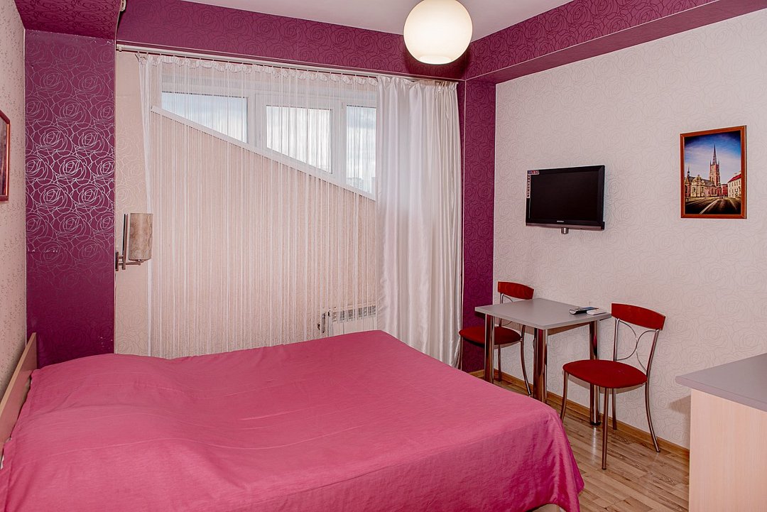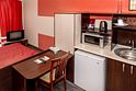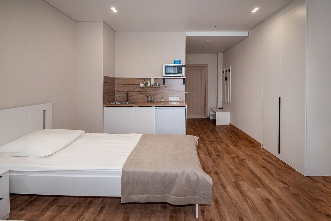 Одна комната (18 м.кв): одна кровать (160х200 см), кондиционер, телевизор (d 54 см), кабельное телевидение, интернет (Wi-Fi), телефон, журнальный столик, стулья. Щетка для обуви, щетка для одежды. Мини-кухня: посуда, холодильник, СВЧ-печь электрочайник, фильтр для воды. Ванная комната: душевая кабина, унитаз, биде, парфюмерно-косметические изделия.Услуги и удобства
