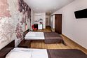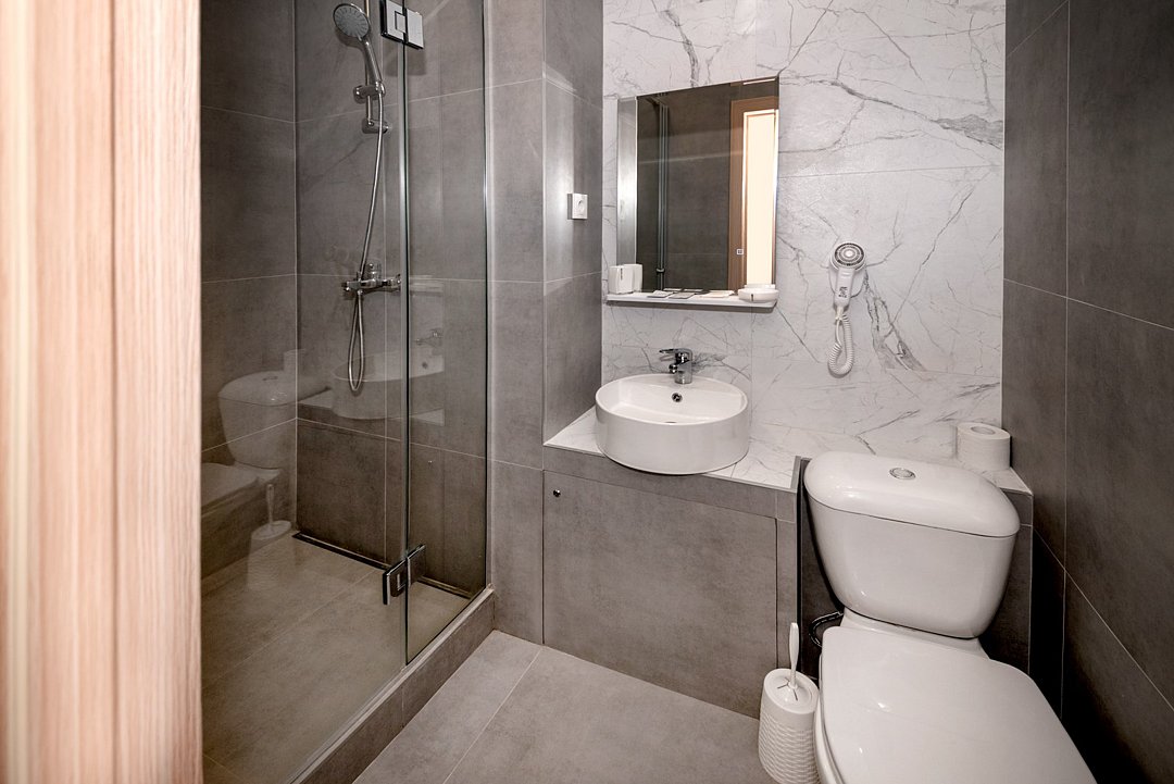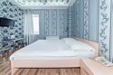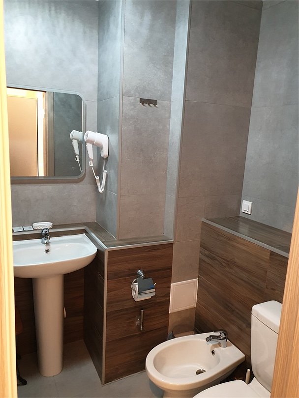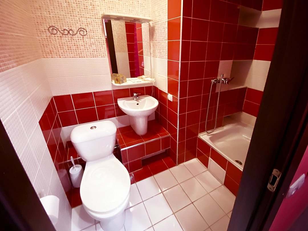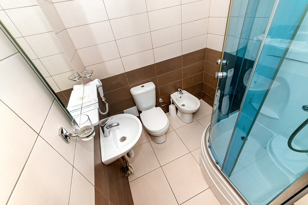 Номер в римском стиле – это удачная интеграция римских мотивов в современный интерьер. Цветовая гамма выдержана в строгом изысканном стиле, который присущ римским интерьерам. Одна комната (24 м.кв): две кровати (90х200 см), телевизор (d 54 см), кабельное телевидение, интернет (Wi-Fi), телефон, журнальный столик, кондиционер. Щетка для обуви, щетка для одежды. Мини-кухня: посуда, холодильник, СВЧ-печь, электрочайник, фильтр для воды. Ванная комната: душевая кабина, биде, фен, парфюмерно-косметические изделия.Услуги и удобства