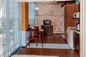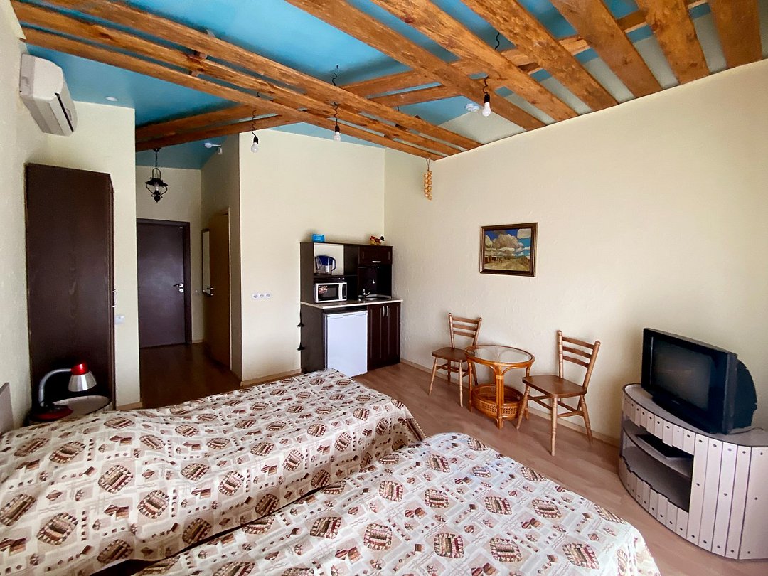 Выполнен в природном стиле. Одна комната (23 м.кв): две кровати (90х200 см), кондиционер, телевизор (d 54 см), кабельное телевидение, интернет (Wi-Fi), телефон, журнальный столик, стулья. Щетка для обуви, щетка для одежды. Мини-кухня: посуда, холодильник, СВЧ-печь, электрочайник, фильтр для воды. Ванная комната: душевая кабина, биде, парфюмерно-косметические изделия.Услуги и удобства