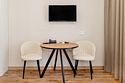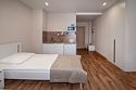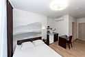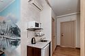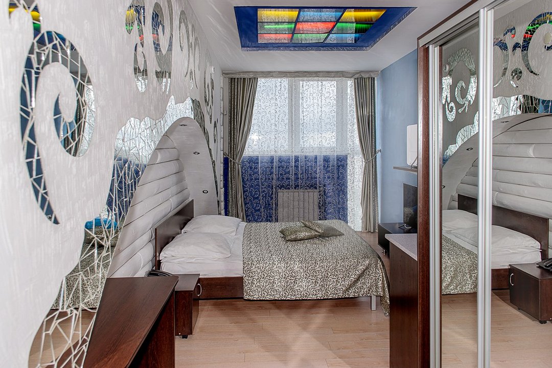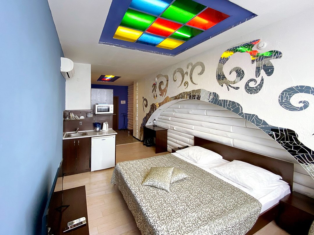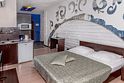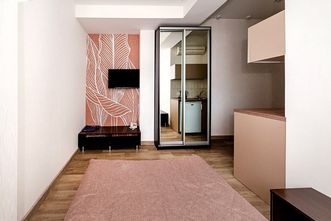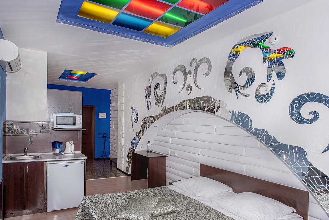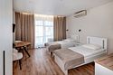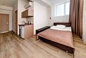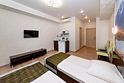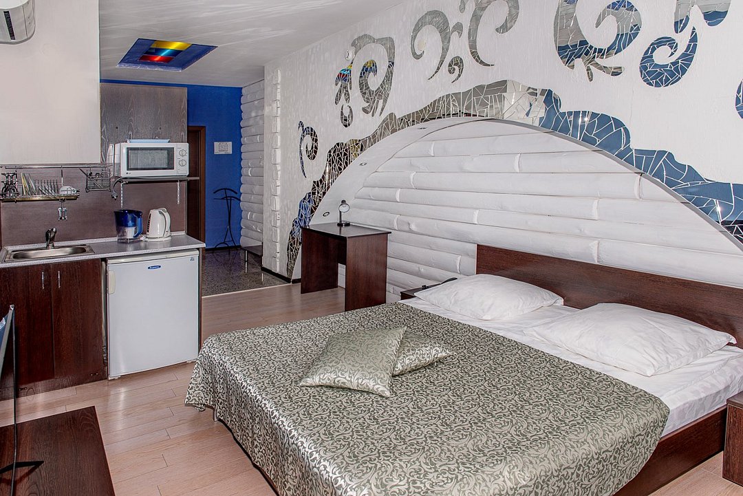 Одна комната (18 м.кв): одна кровать (160х200 см), кондиционер, телевизор (d 54 см), кабельное телевидение, интернет (Wi-Fi), телефон, журнальный столик, стулья. Щетка для обуви, щетка для одежды. Мини-кухня: посуда, холодильник, СВЧ-печь электрочайник, фильтр для воды. Ванная комната: душевая кабина, биде, парфюмерно-косметические изделия.Услуги и удобства