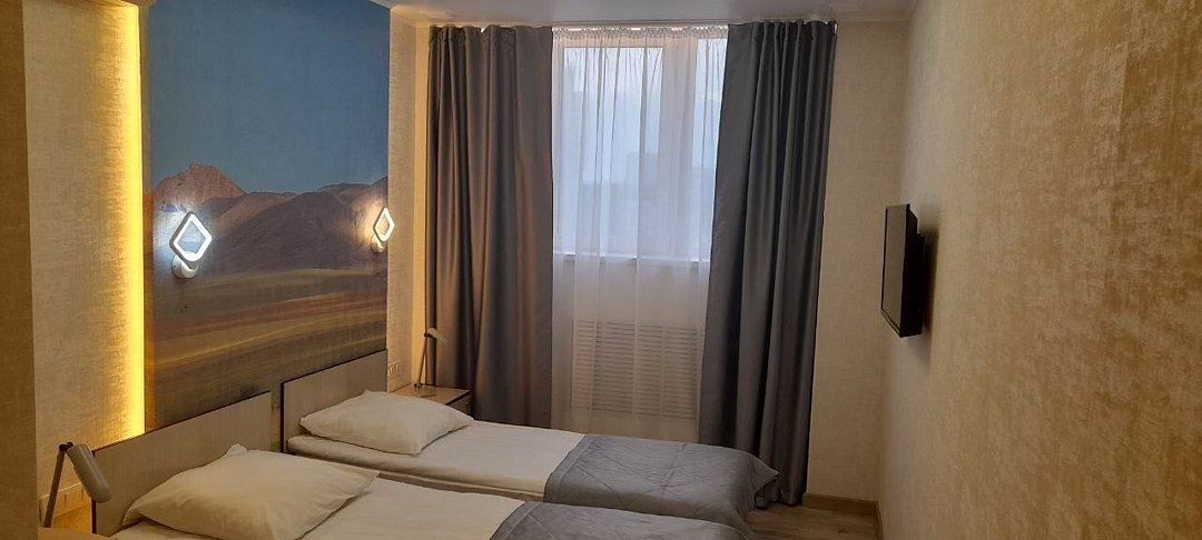 "Степь" выполнен в природном стиле. Одна комната (24 м.кв): две кровати (90х200 см), кондиционер, телевизор (d 54 см), кабельное телевидение, интернет (Wi-Fi), телефон, круглый стол, стулья. Щетка для обуви, щетка для одежды. Мини-кухня: посуда, холодильник, СВЧ-печь, электрочайник, фильтр для воды. Ванная комната: душевая кабина, биде, парфюмерно-косметические изделия.Услуги и удобства