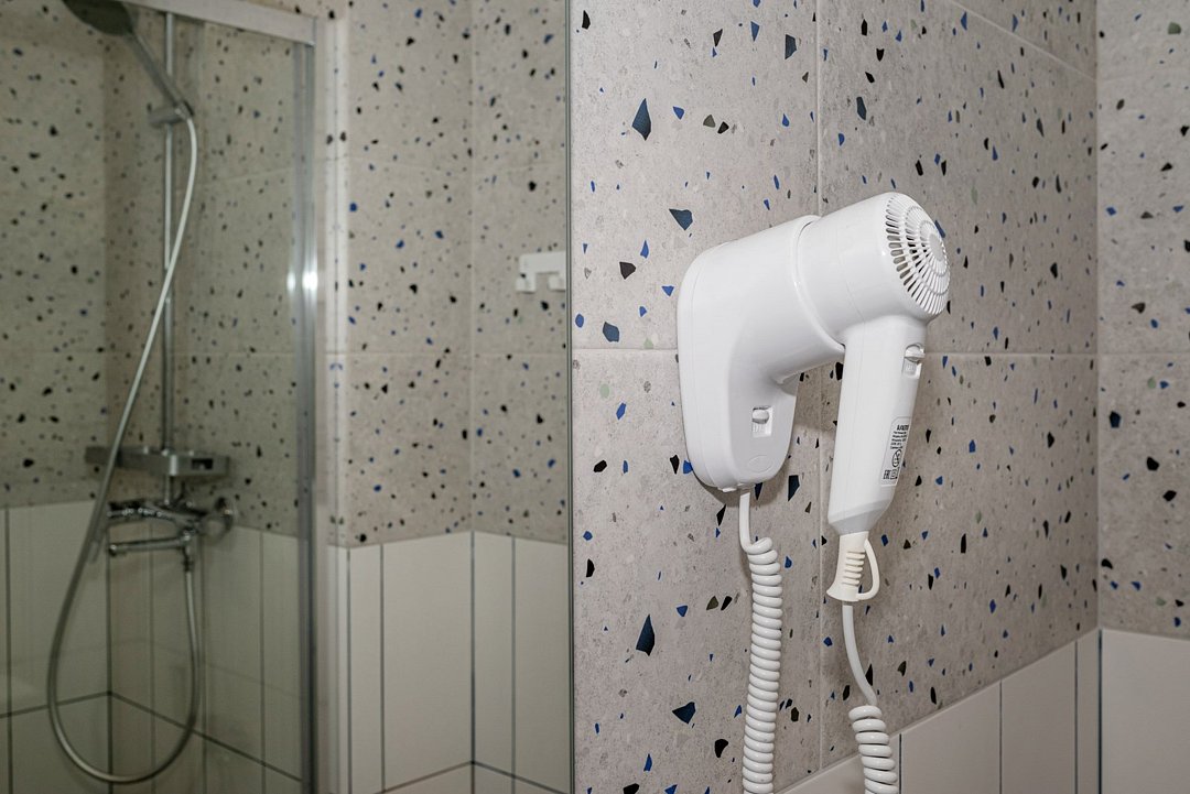 телевизор, кабельное телевидение, Wi-Fi, интернет, телефон, фен, микроволновая печь, санузел, односпальная кровать, стулья, зеркало, чайник, унитаз, раковина, душ, вид на город, туалетные средства, туалет, мини-холодильник, мылоВ номере