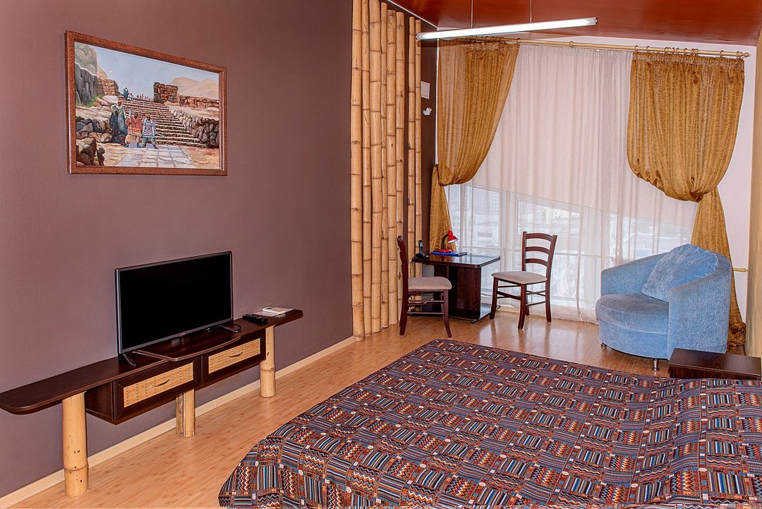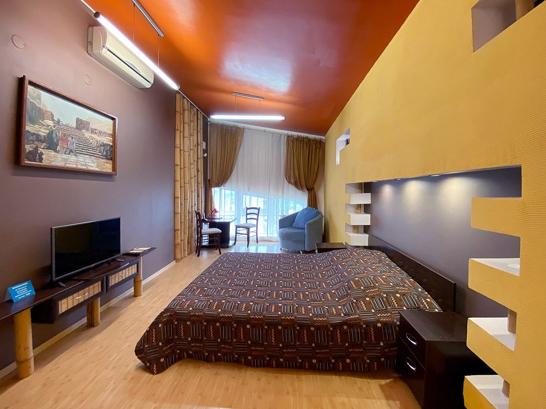 «Африка» перенесет постояльцев в этнический мир африканских племен. Одна комната (26 м.кв): одна кровать (160х200 см), кондиционер, телевизор (d 51 см), кабельное телевидение, интернет (Wi-Fi), телефон, журнальный столик, кресло, стулья. Щетка для обуви, щетка для одежды. Мини-кухня: посуда, холодильник, СВЧ-печь, электрочайник, фильтр для воды. Ванная комната: душевая кабина, биде, парфюмерно-косметические изделия.Услуги и удобства