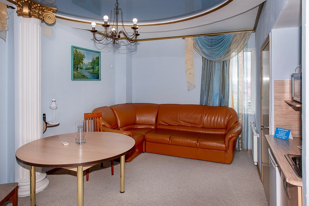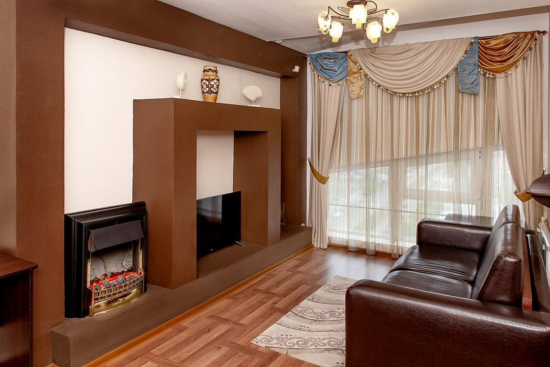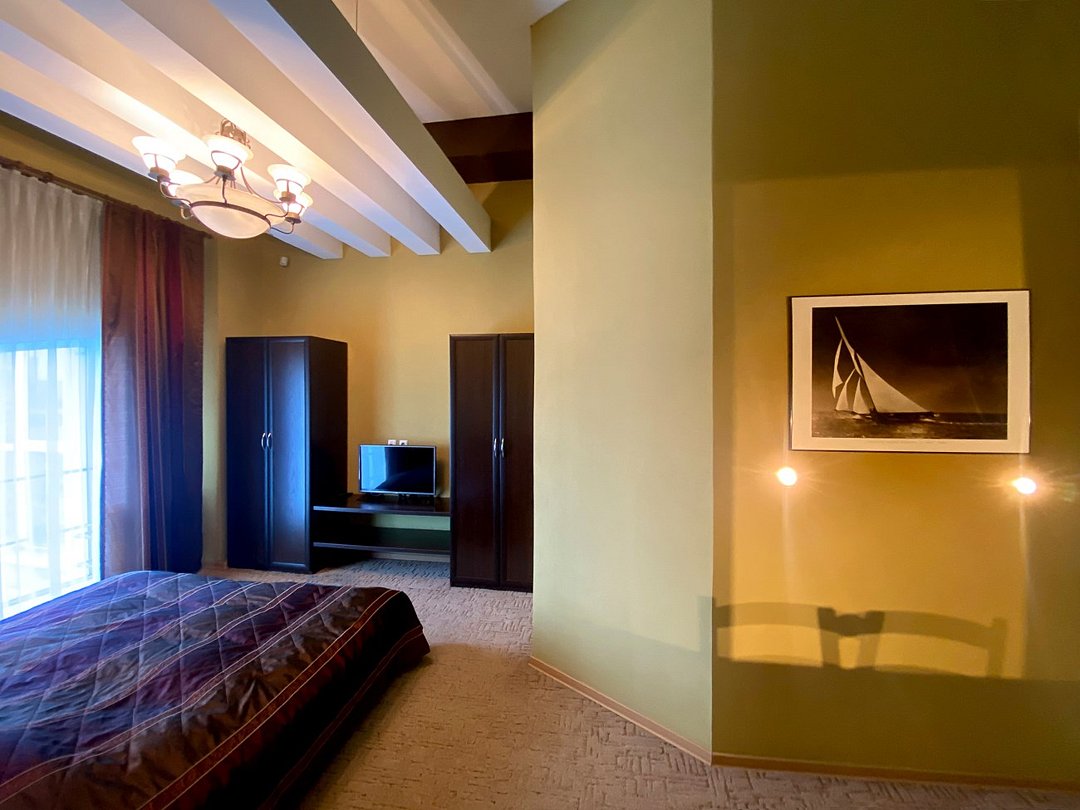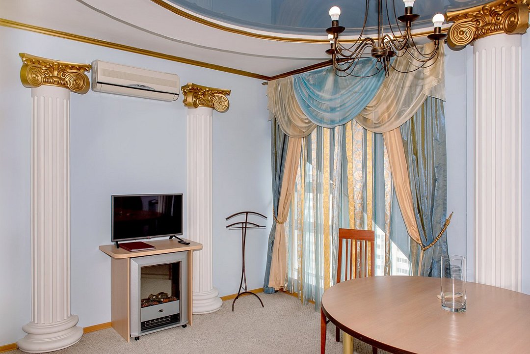 Номер-люкс «Классика» выполнен в истинно классическом стиле, со всей его строгостью и роскошью. Это светлые комнаты, пастельные тона отделки, текстиля и мебели, которые делают все пространство номера еще светлее. Две комнаты (37 м.кв): одна кровать (180х200 см), кондиционер, гардероб, мягкая мебель, телевизор (d 72 см), кабельное телевидение, интернет (Wi-Fi), телефон, электрокамин, круглый стол , стулья. Щетка для обуви, щетка для одежды. Мини-кухня: посуда, СВЧ-печь, холодильник, электрочайник, фильтр для воды. Ванная комната: ванна, биде, фен стационарный, халат махровый, разовые тапочки, парфюмерно-косметические изделия.Услуги и удобства