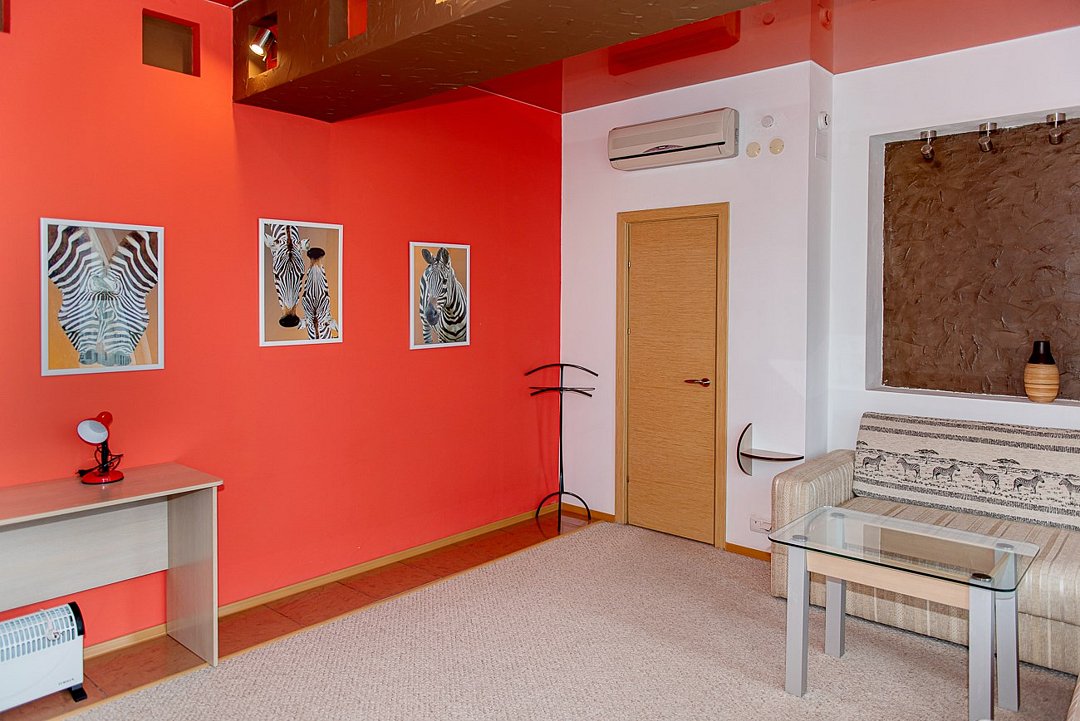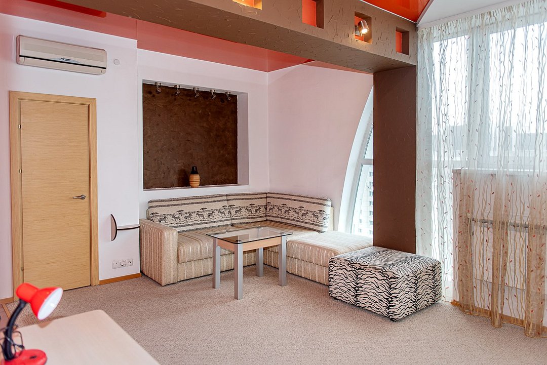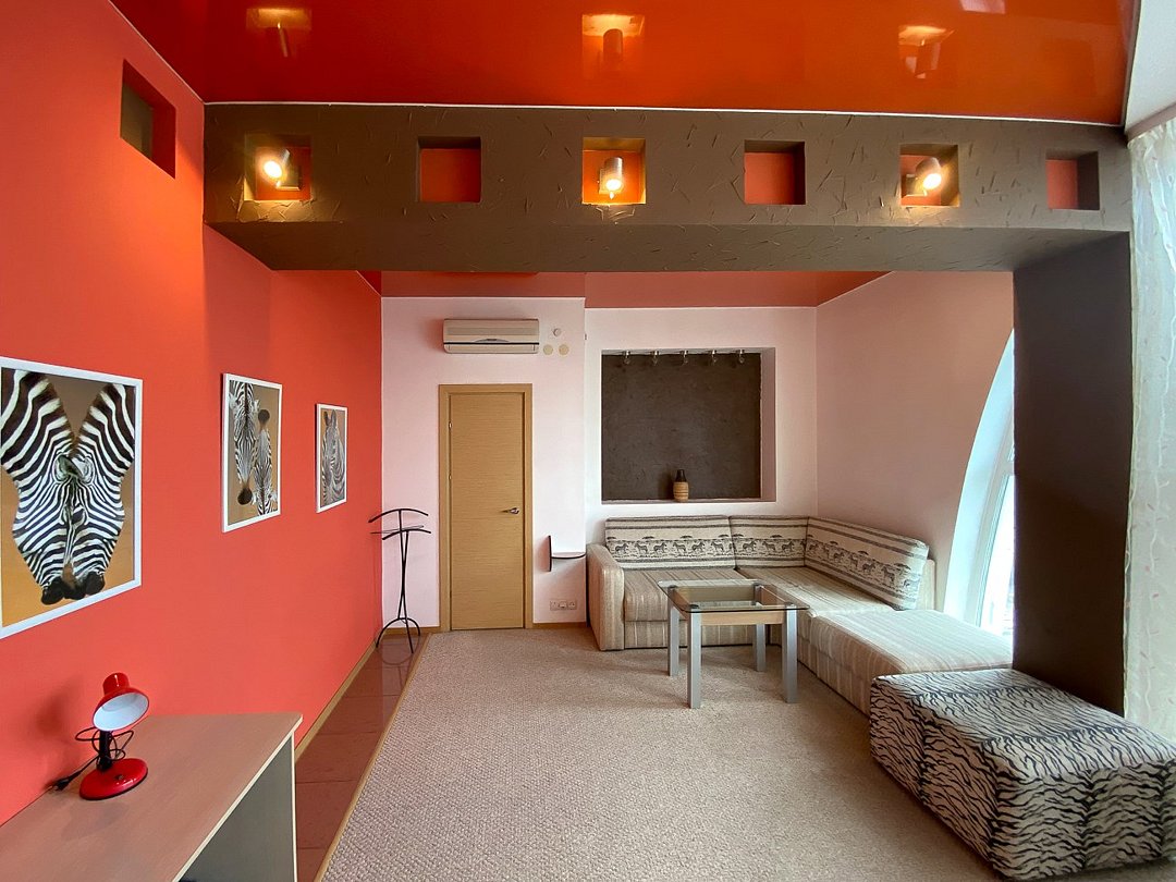 «Модерн» – идеален для людей, любящих неординарность и элегантную простоту интерьера. Две комнаты (42 м.кв): одна кровать (180х200 см), кондиционер, гардероб, мягкая мебель, телевизор (d 72 см), кабельное телевидение, интернет (Wi-Fi), телефон, журнальный столик. Щетка для обуви, щетка для одежды. Мини-кухня: посуда, СВЧ-печь, холодильник, электрочайник, фильтр для воды. Ванная комната: ванна, биде, фен стационарный, халат махровый, разовые тапочки, парфюмерно-косметические изделия.Услуги и удобства