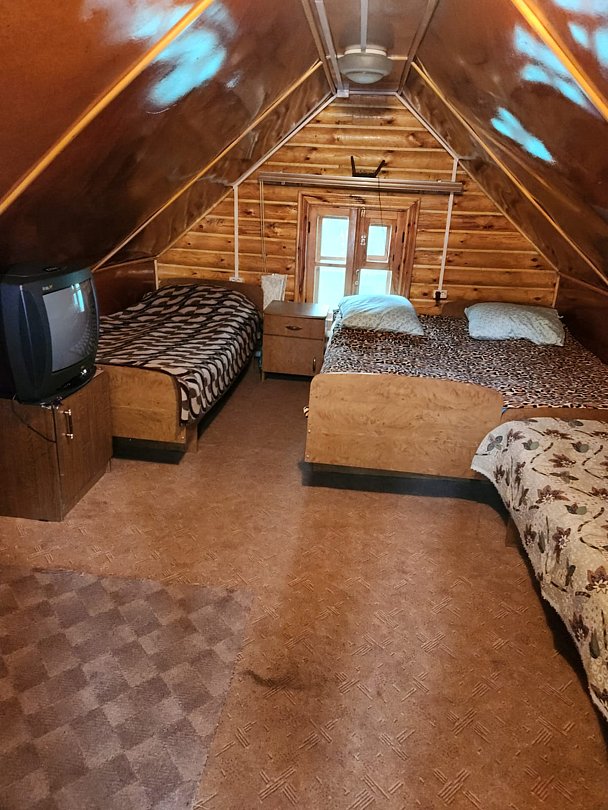 На втором этаже имеются: двухспальная кровать и 2 односпальные кровати, телевизор, тумба.