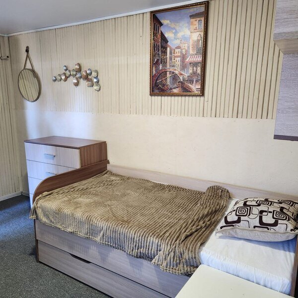 На первом этаже имеются: двухспальная кровать и 2 односпальные кровати, телевизор, тумба.