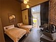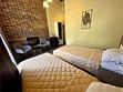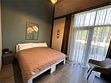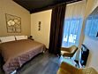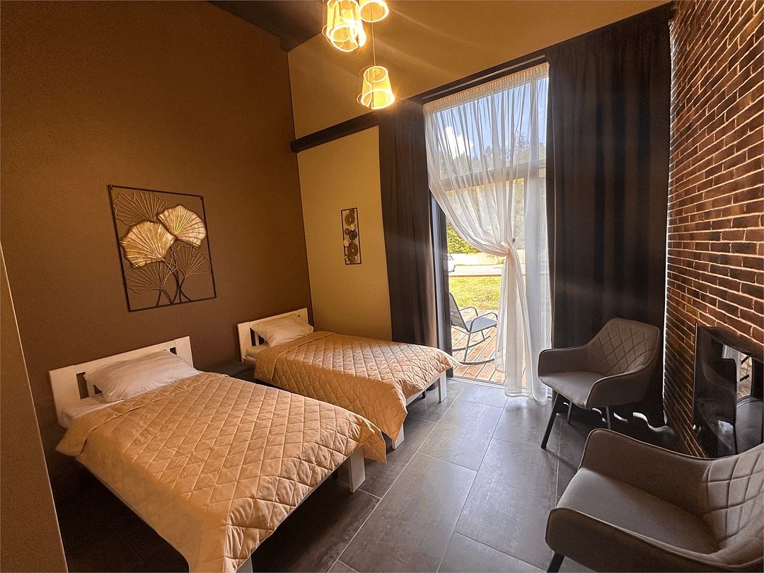 Номер стандарт с электрокамином, расположен выходом на внутренний двор гостиницы, имеет собственную приватную террасу и мангальную зону. В нем комфортно проводить время вдвоем, (двуспальная кровать, на две кровати не разбирается) находится вблизи купели фурако и бани.