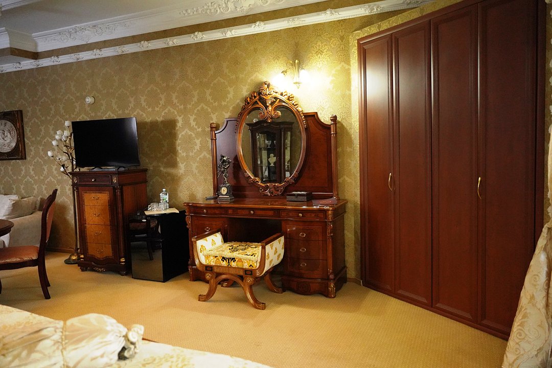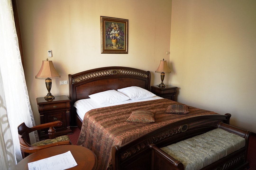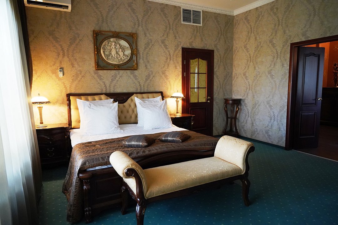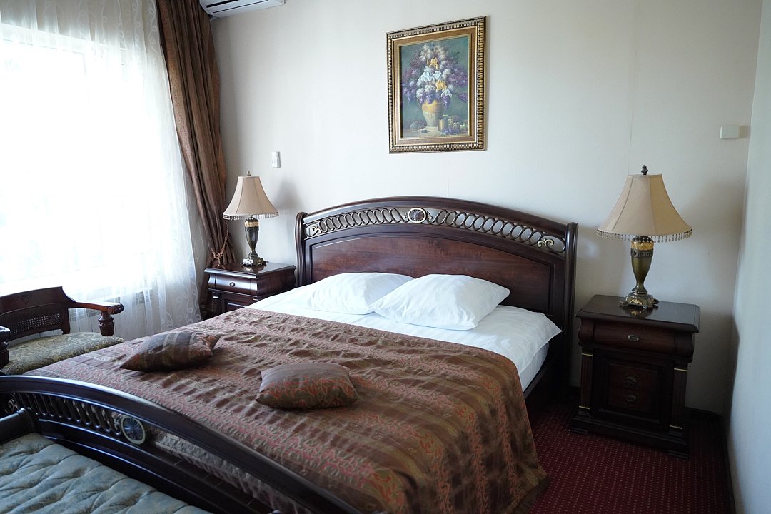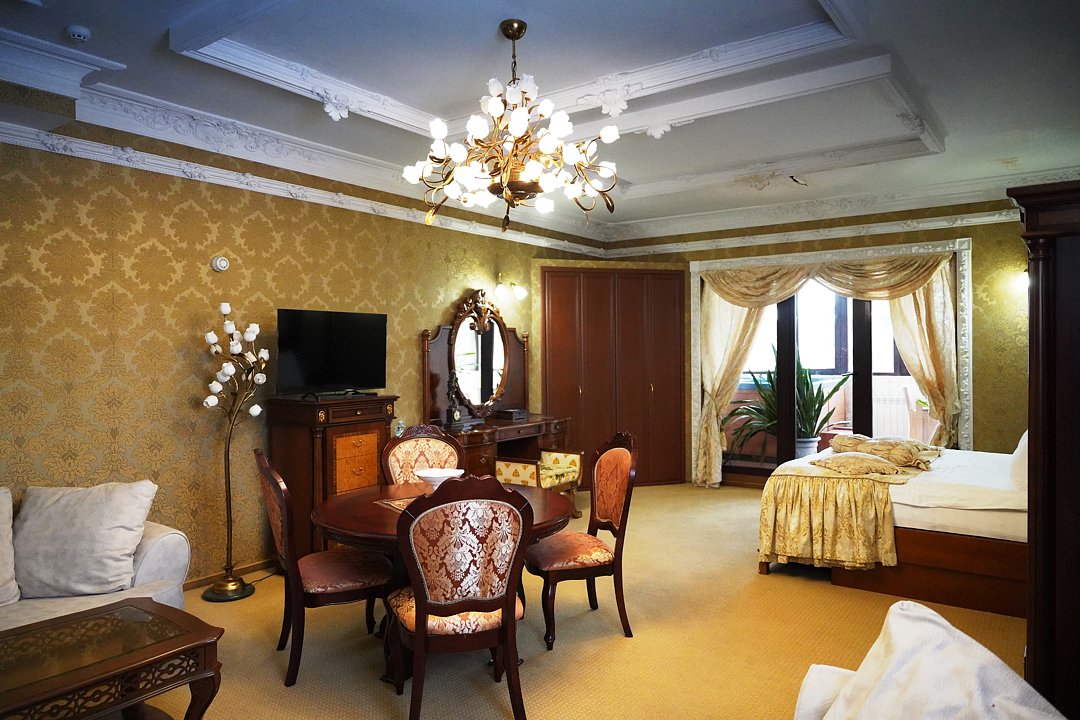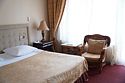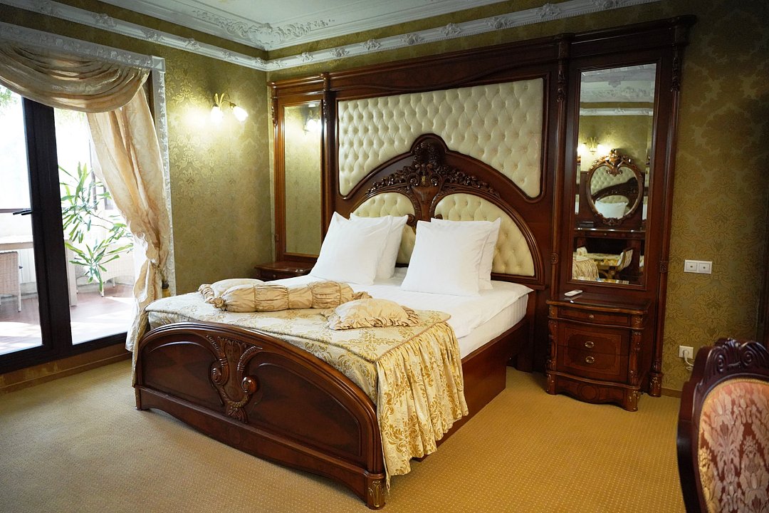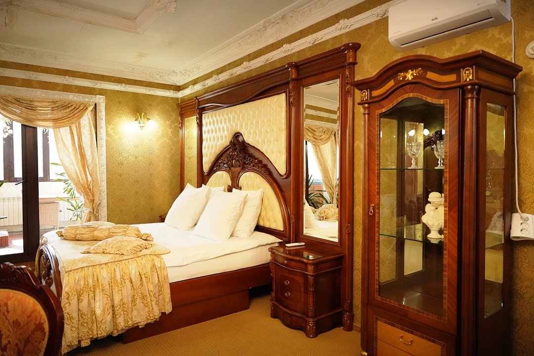 Просторный двухкомнатный номер с гостиной комнатой с комфортной мягкой мебелью и предметами антиквариата, спальней с большой двуспальной кроватью и двумя балконами. Возможна установка дополнительного спального места — раскладной кровати.