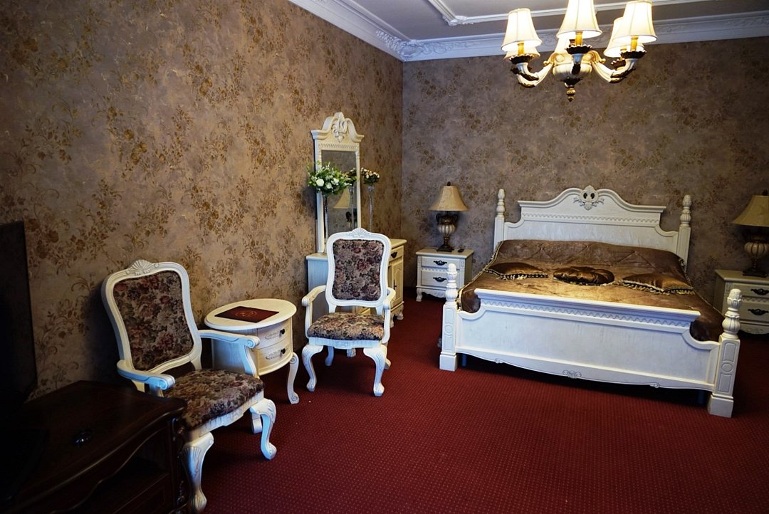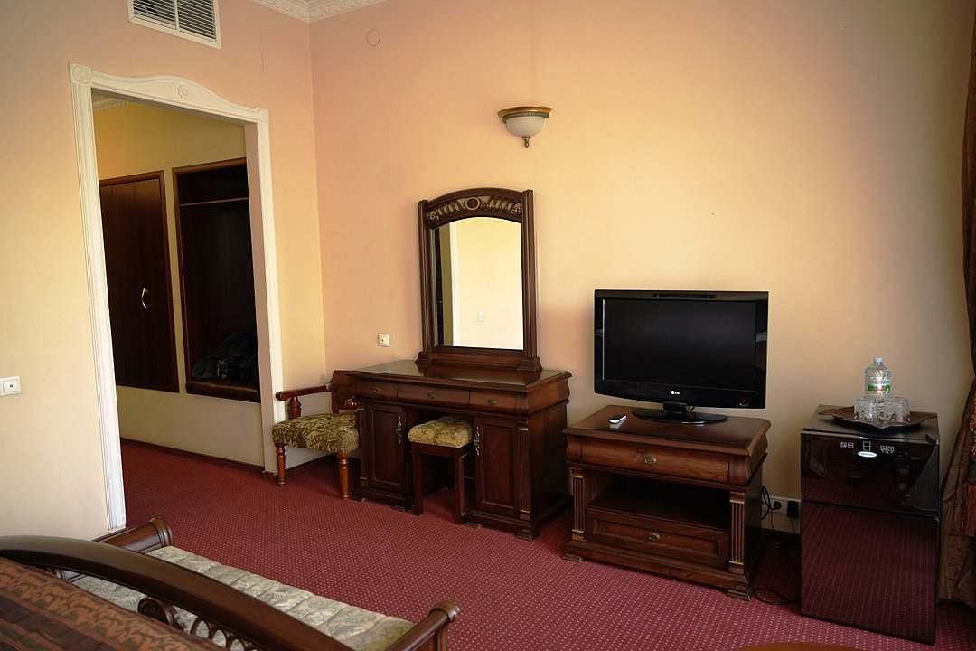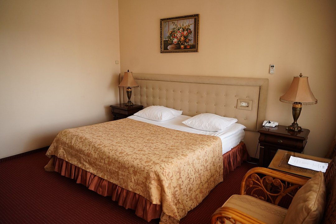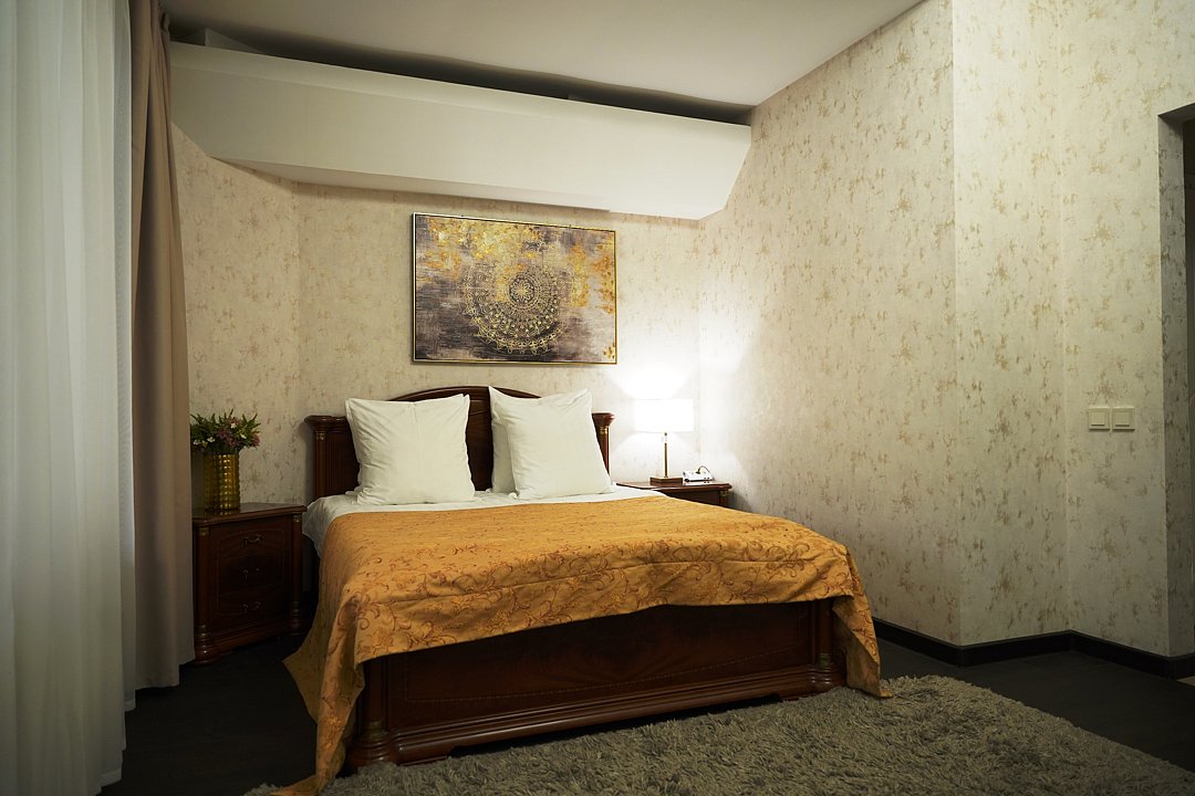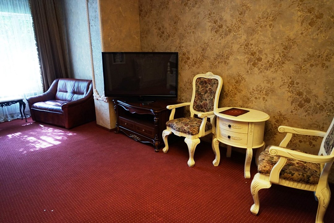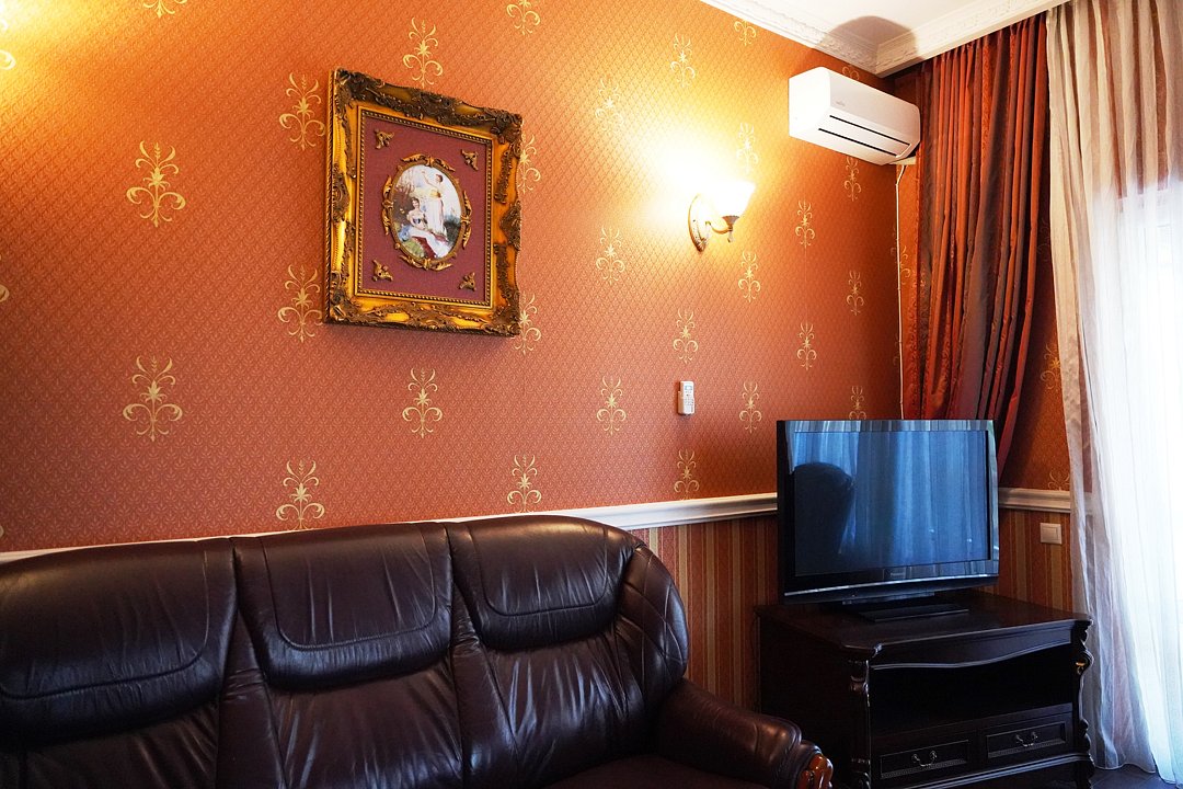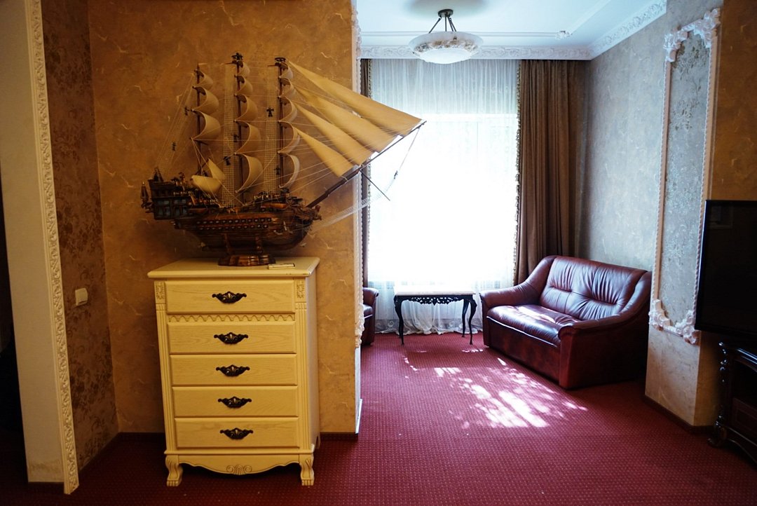 Просторный двухкомнатный номер с гостиной комнатой с комфортной мягкой мебелью и предметами антиквариата, спальней с большой двуспальной кроватью и двумя балконами. Возможна установка дополнительного спального места — раскладной кровати.
