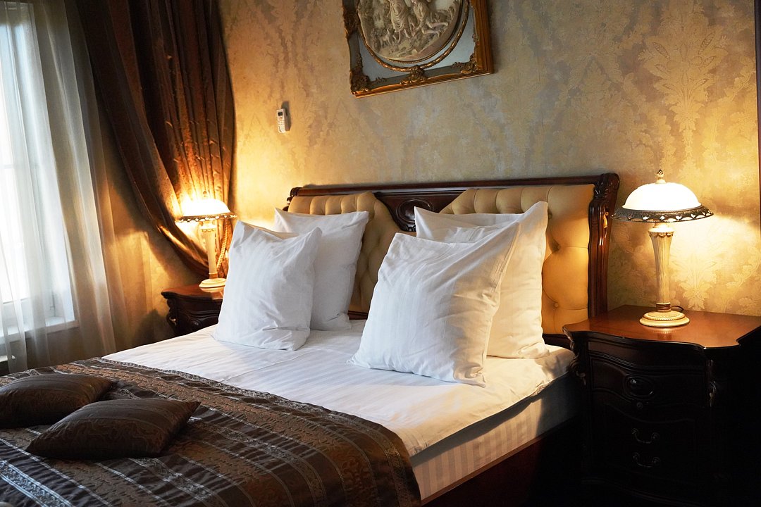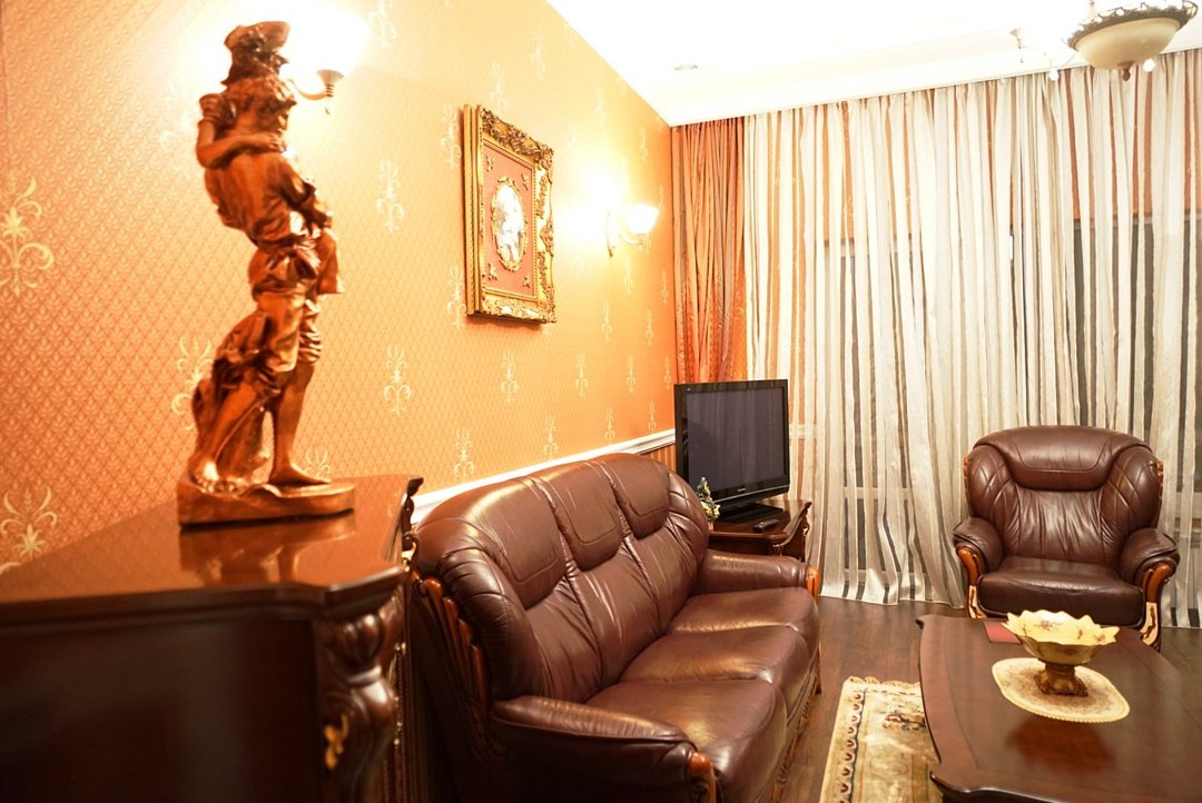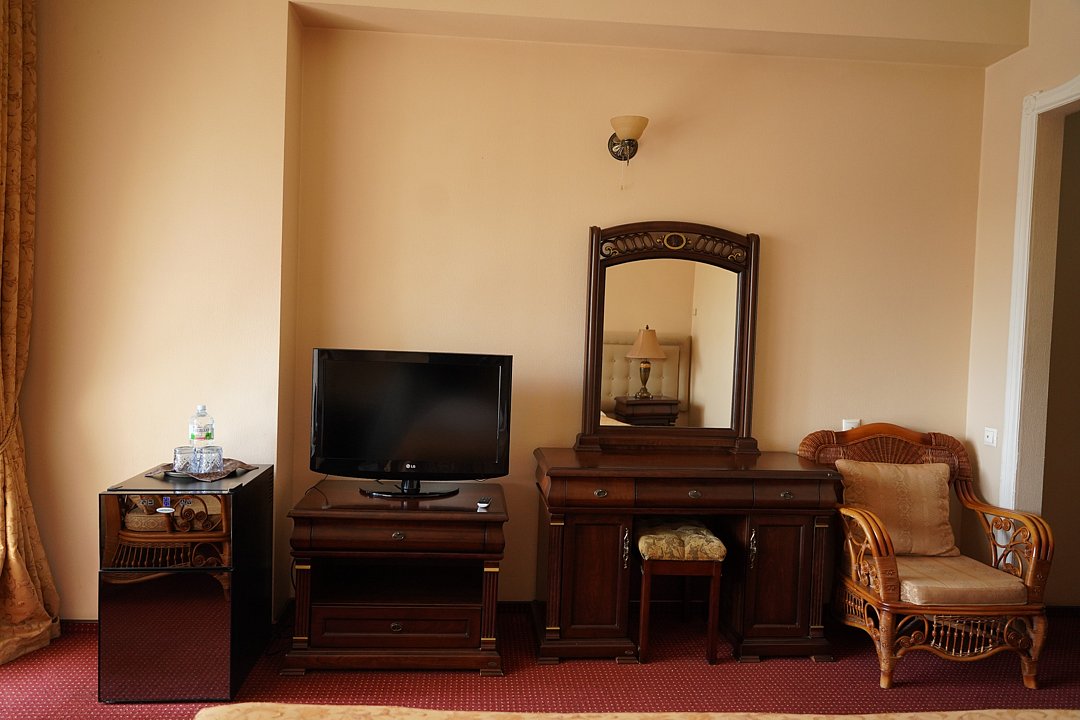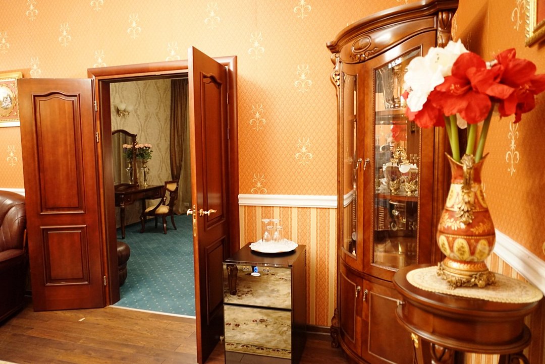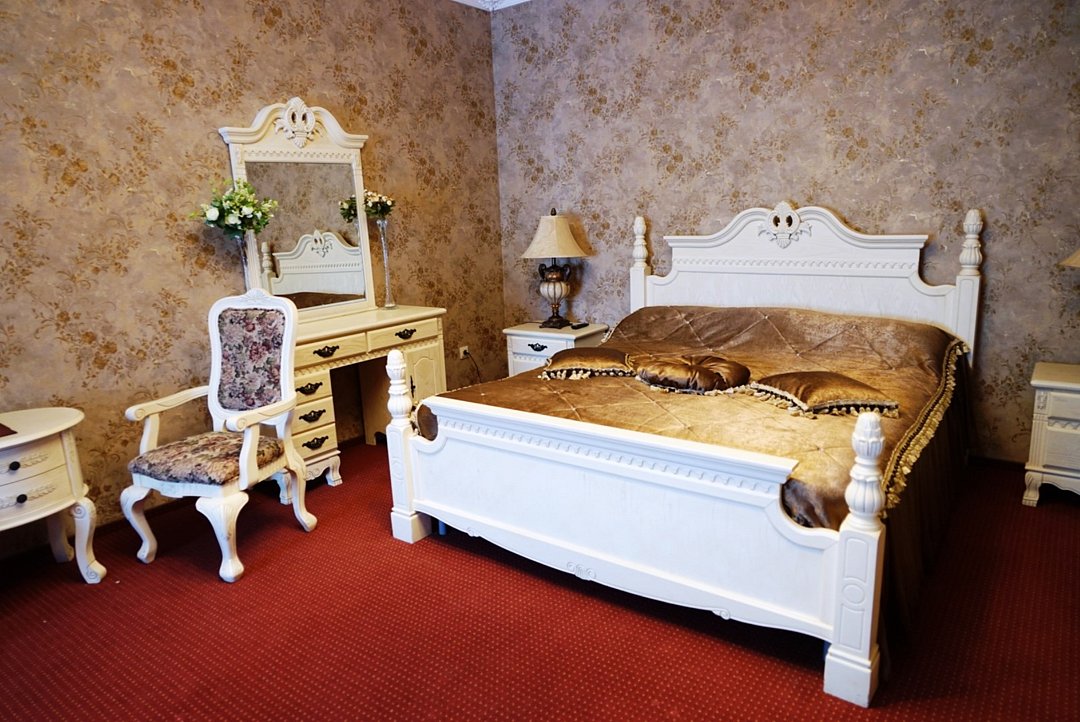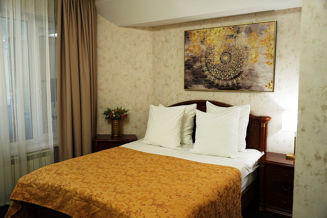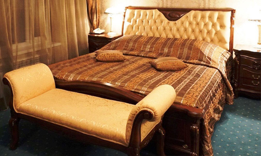 Просторный двухкомнатный номер с гостиной комнатой с комфортной мягкой мебелью и предметами антиквариата, спальней с большой двуспальной кроватью и двумя балконами. Возможна установка дополнительного спального места — раскладной кровати.