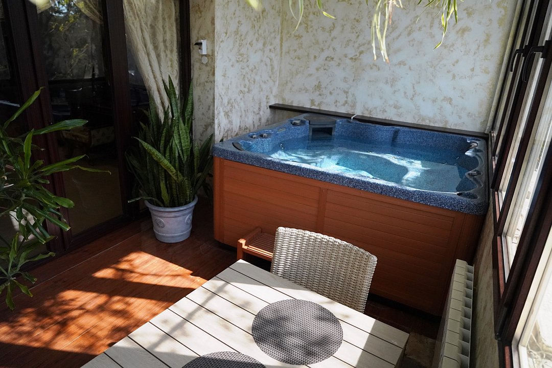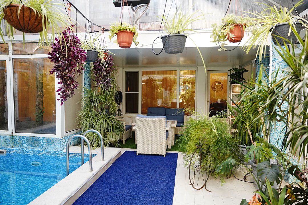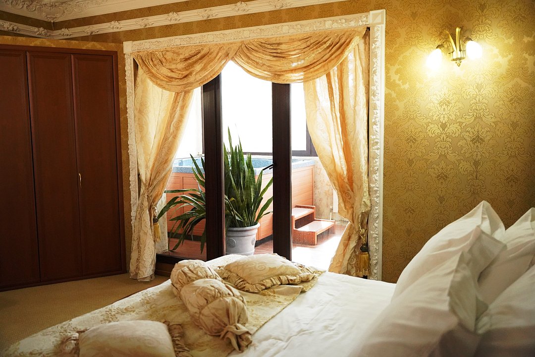 Просторный однокомнатный разделенный на спальню с большой двуспальной кроватью и собственный зимний сад с теплым бассейном. Возможна установка дополнительного спального места — раскладной кровати.