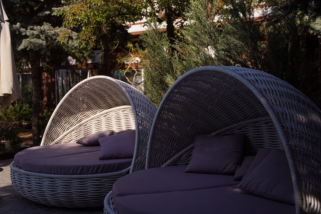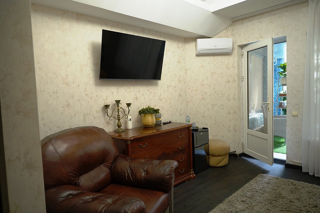 Просторный однокомнатный номер разделенный на гостиную зону с кожаной мягкой мебелью и спальней с большой двуспальной кроватью. С отдельным выходом к бассейну. Возможна установка дополнительного спального места — раскладной кровати.