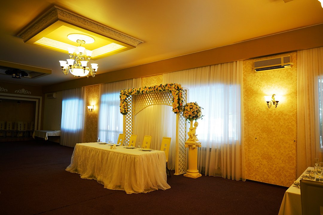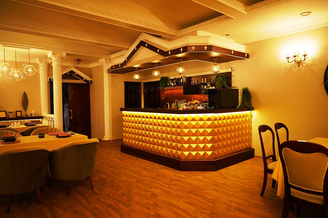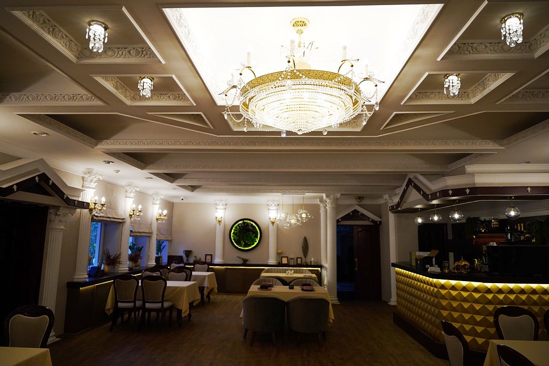 Интерьер заведения выполнен в лучших традициях стиля классицизм и барокко.