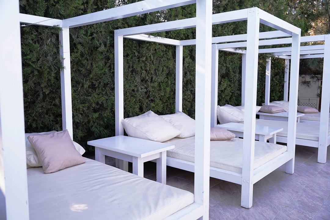 На территории расположена детская площадка для маленьких посетителей. По периметру оборудована зона для отдыха с раскладными лежаками и зонтиками.