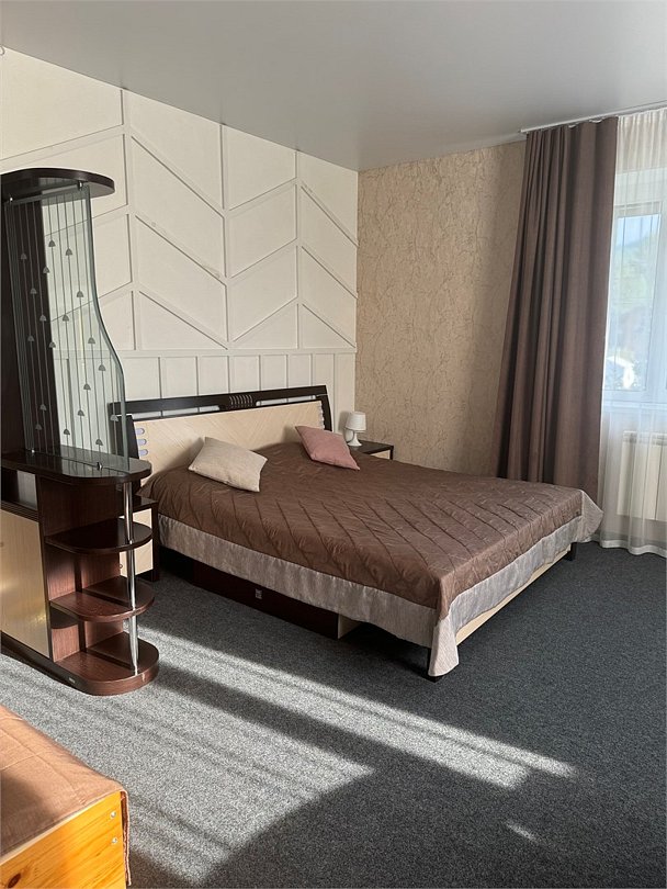 Wi-Fi, обогреватель, душевая кабина, кровать «King size», полутораспальная кровать, кресла, шкаф для одежды, вешалки, журнальный столик, зеркало, комод, чайный набор, обслуживание номеров, чайник, унитаз, раковина, питьевая вода, ковровое покрытие, общая ванная комната, стаканы, туалетные средства, туалет, раскладной диван, телевизор с плоским экраном, вид на горы, угловой диван-кроватьВ гостиничном номере