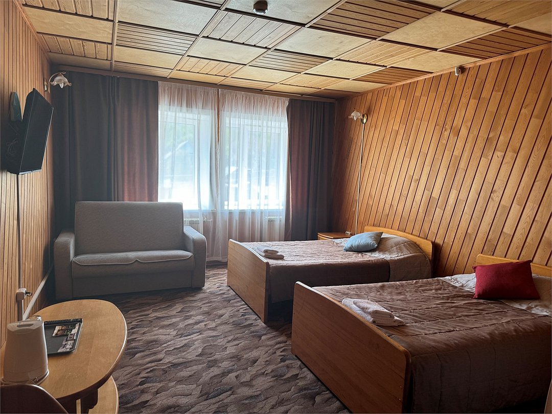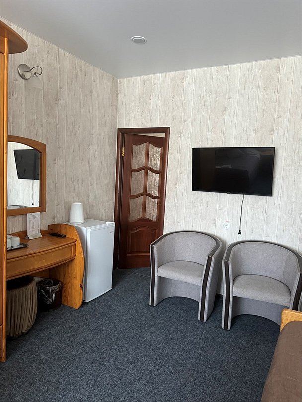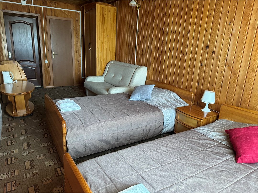 Семейный двухкомнатный номер с одной двуспальной кроватью и тремя односпальными кроватями. Собственная ванная комната оснащена душевой кабиной, гигиеническими принадлежностями. В номере имеется холодильник, чайник, чайные принадлежности, телевизор.Услуги и удобства
