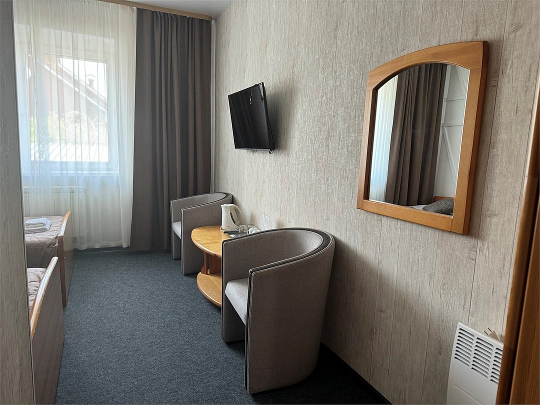 кабельное телевидение, Wi-Fi, светильник, будильник, обогреватель, ванная комната, душевая кабина, санузел, две односпальные кровати, шкаф для одежды, вешалки, журнальный столик, зеркало, чайный набор, набор посуды, чайник, питьевая вода, ковровое покрытие, отопление, кресло, вид во двор, стаканы, туалетный столик, туалетный столик, туалетные средства, телевизор с плоским экраном, вид на горы, номер для некурящих, пуфикВ гостиничном номере