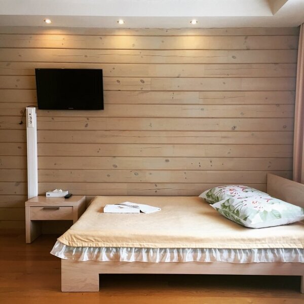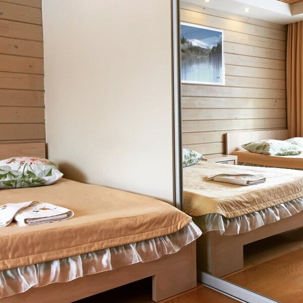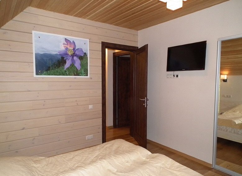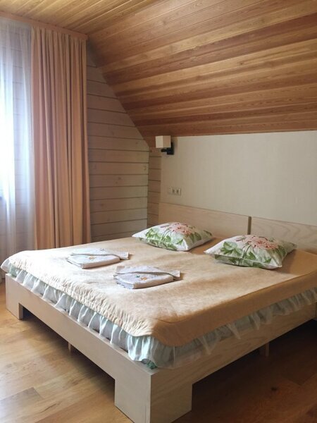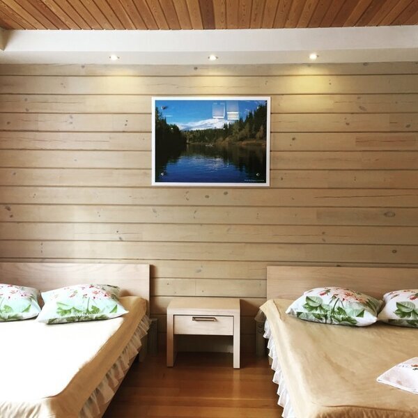 В отеле два одинаковых деревянных коттеджа, каждый рассчитан на компанию до 10 человек. В доме есть оборудованная кухня: плита, чайник, холодильник, микроволновая печь, необходимая посуда, 2 сан узла, душ, ванная, 2 спальни с широкими кроватями (ширина 180 см), в третьей спальне 3 кровати (шириной 140 см). В гостиной 2 дивана. TV, wi-fi.