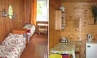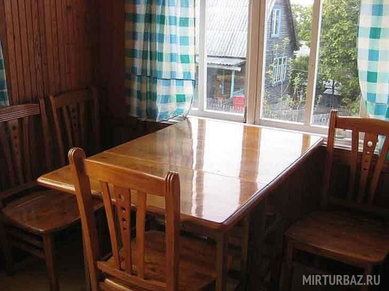 1-й этаж - кухня (кухонный гарнитур, холодильник, печка, чайник, набор посуды, стол, стулья, телевизор), две спальни (в каждой четыре односпальные кровати, шкаф); 2-й этаж - спальня (две односпальные кровати, шкаф), мансарда.