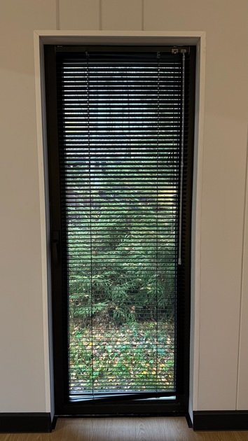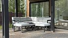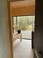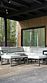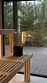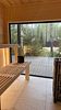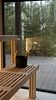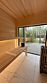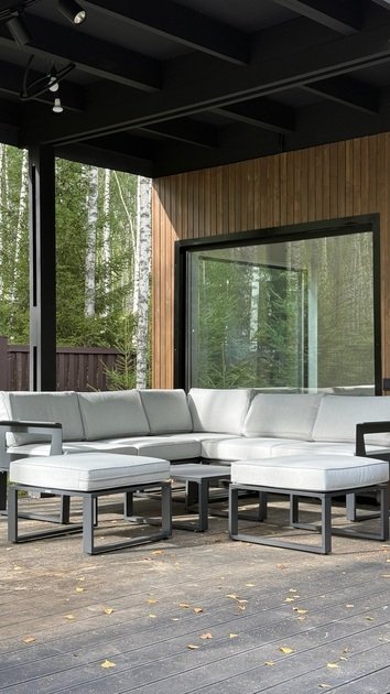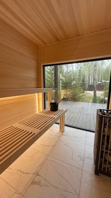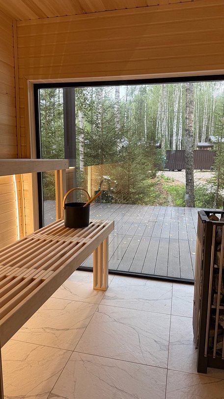 Терраса с мягким диваном и панорамная сауна с высокими потолками и лесными пейзажами создают атмосферу покоя и уюта. Минималистичный дизайн способствует комфортному отдыху.