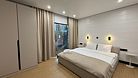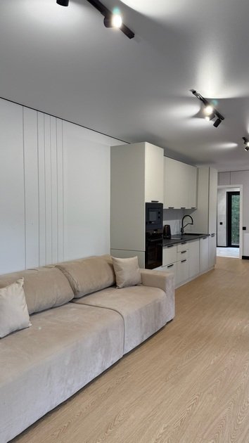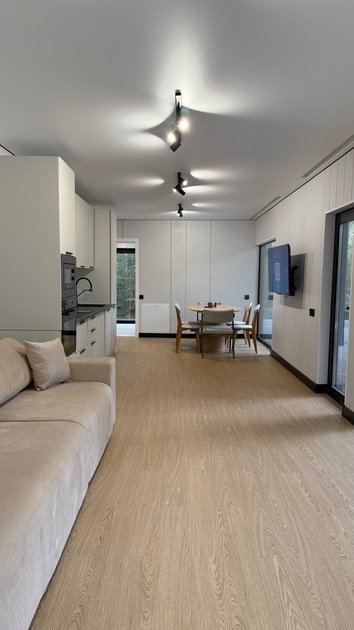 Интерьер включает две просторные спальни с двуспальными кроватями, гостиную с большим диваном, кухню с плитой, холодильником, посудой и техникой, санузел с душевой кабиной, постельное белье, полотенца, мыло и принадлежности, интернет и смарт-ТВ.
