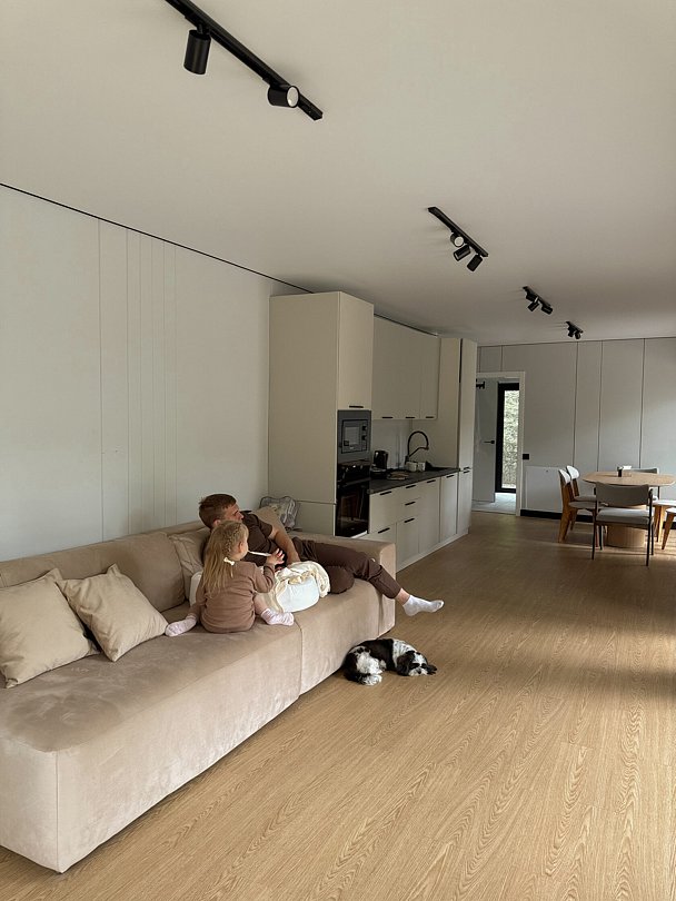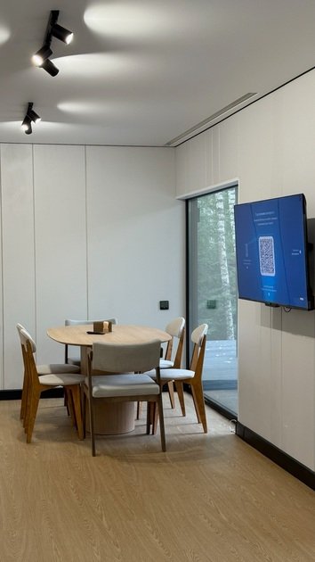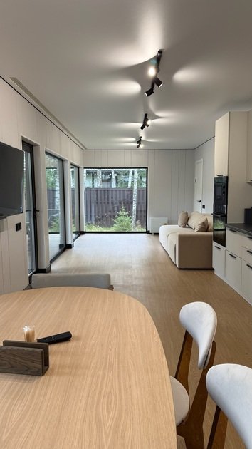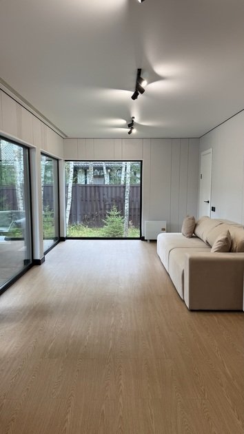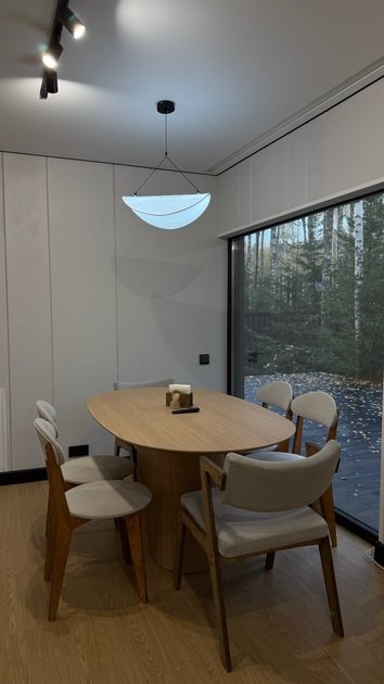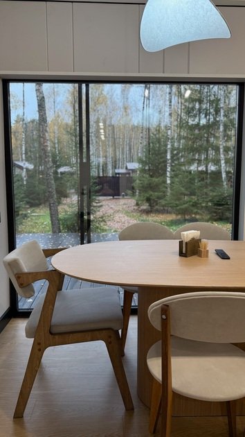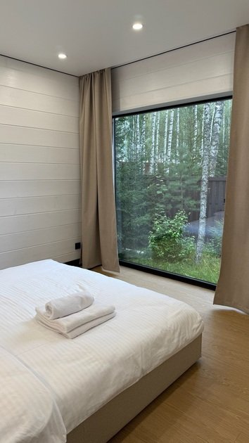 Дом в стиле хай-тек с панорамным видом на лес и террасой для отдыха. Просторный и светлый интерьер идеально подходит для пары, семьи или небольшой компании.