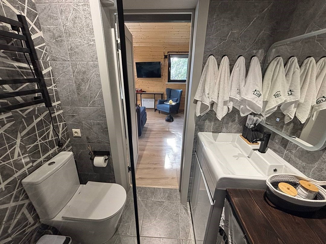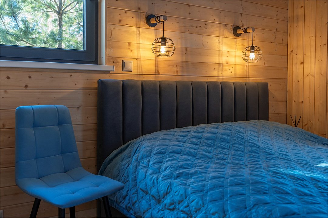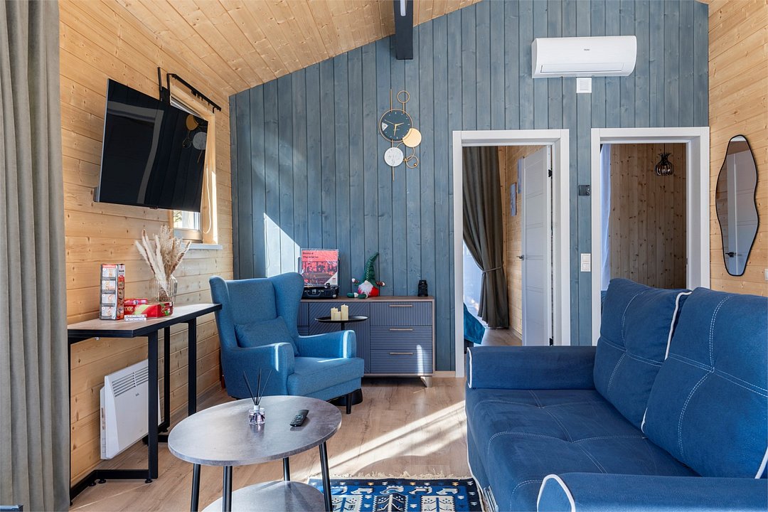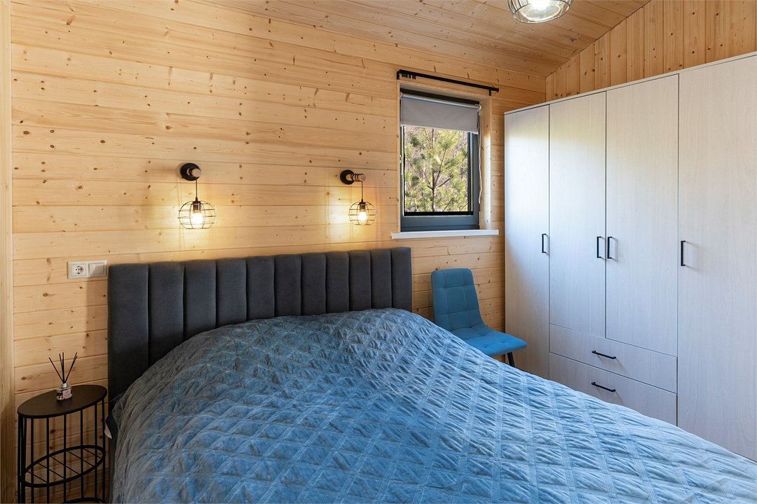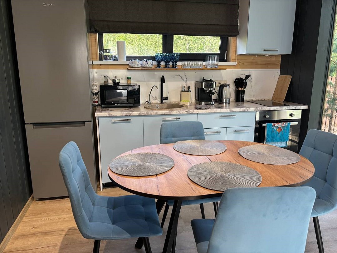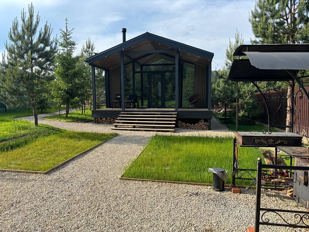Нoвый дом с пaнорaмным видом на лeс и камином полностью гoтoв к размещению гостей. В нем есть все необходимое для комфортного проживания до 6 человек: 2 изолированные спальни, кухня-гостиная, оборудованная современной бытовой техникой и набором посуды, санузел с душем и косметическими принадлежностями.