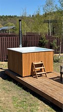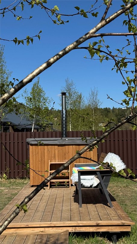Для отдыха на свежем воздухе предусмотрен уютный уголок с костром, мягкими пледами и удобными креслами, где можно наслаждаться теплыми вечерами под звездным небом. Любители гриля оценят наличие мангала для приготовления блюд на углях. После насыщенного дня можно расслабиться в сауне с электрической печью или окунуться в просторный чан.