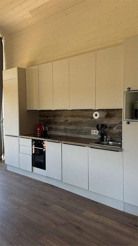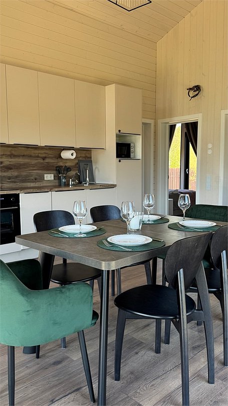 Большая гостиная с удобным раскладным диваном (160х200) совмещена с кухней и обеденной зоной. Кухня оснащена всей необходимой посудой для сервировки и приготовления пищи, индукционной плитой, посудомоечной машиной, духовым шкафом, СВЧ печью, холодильником, электрическим чайником. Также имеется встроенный фильтр очистки питьевой воды.