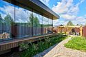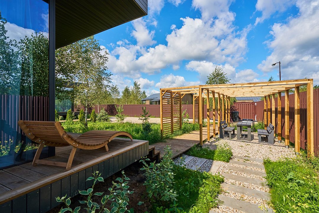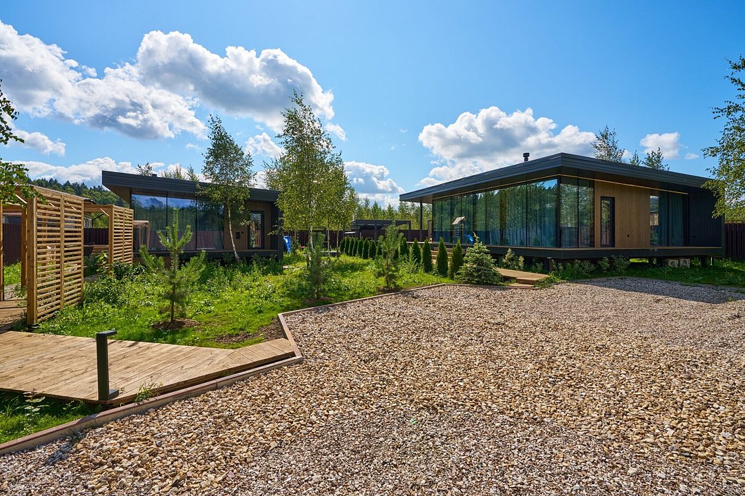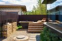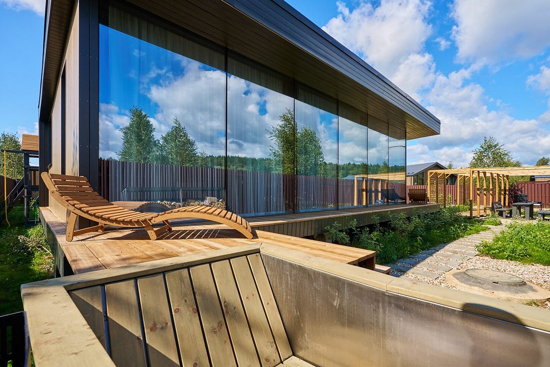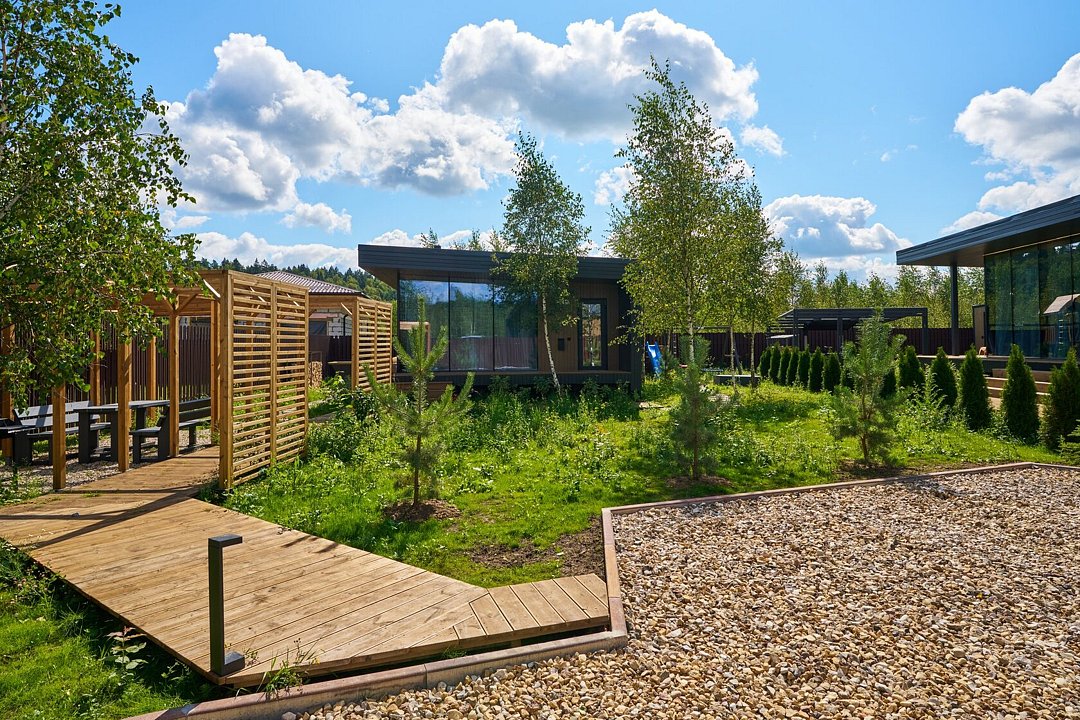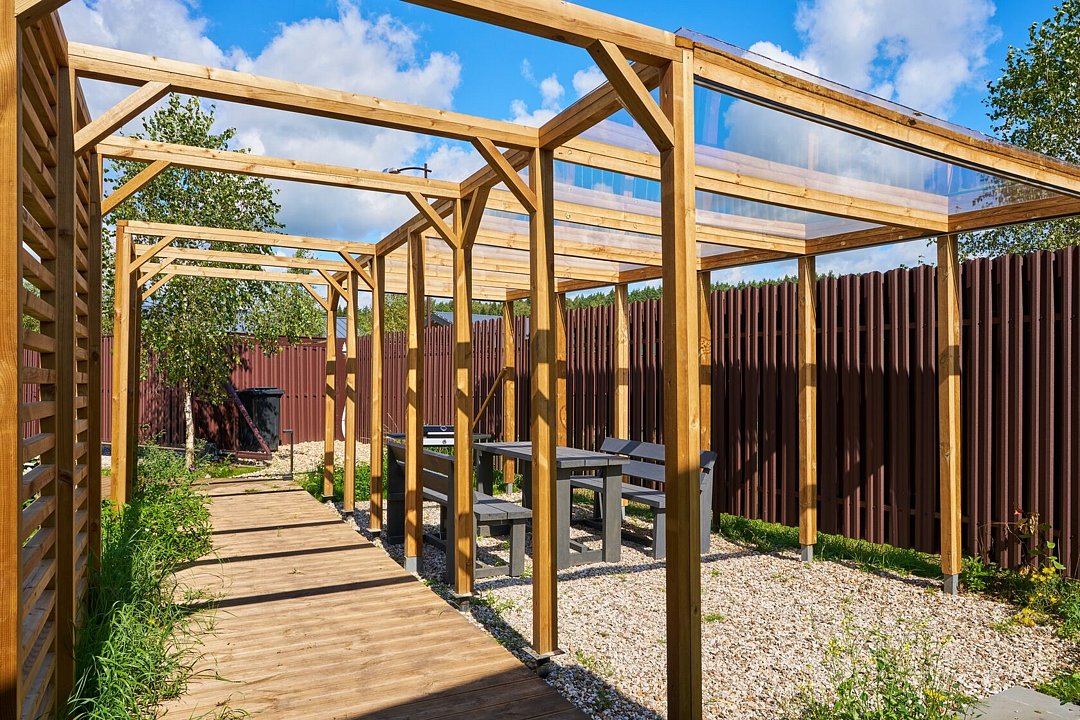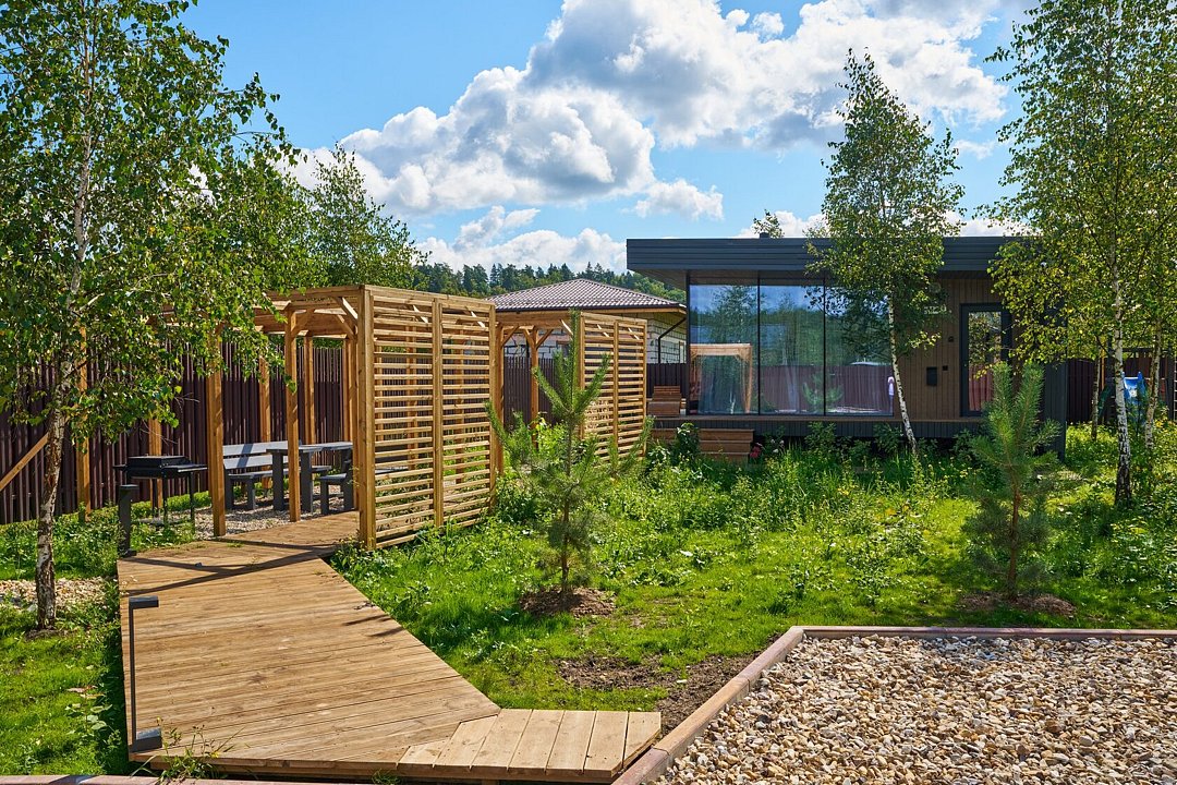 Прекрасная зеленая территория площадью около девяти соток, ухоженная парковочная площадка и терраса, где приятно начать утро чашечкой кофе на свежем воздухе или приготовить вкуснейший ужин на мангале. Для полного расслабления предусмотрена отдельная зона отдыха возле костра, оснащенная креслами, позволяющими наслаждаться звездным небом вечером. Безопасность пребывания гарантируют современные системы видеонаблюдения.