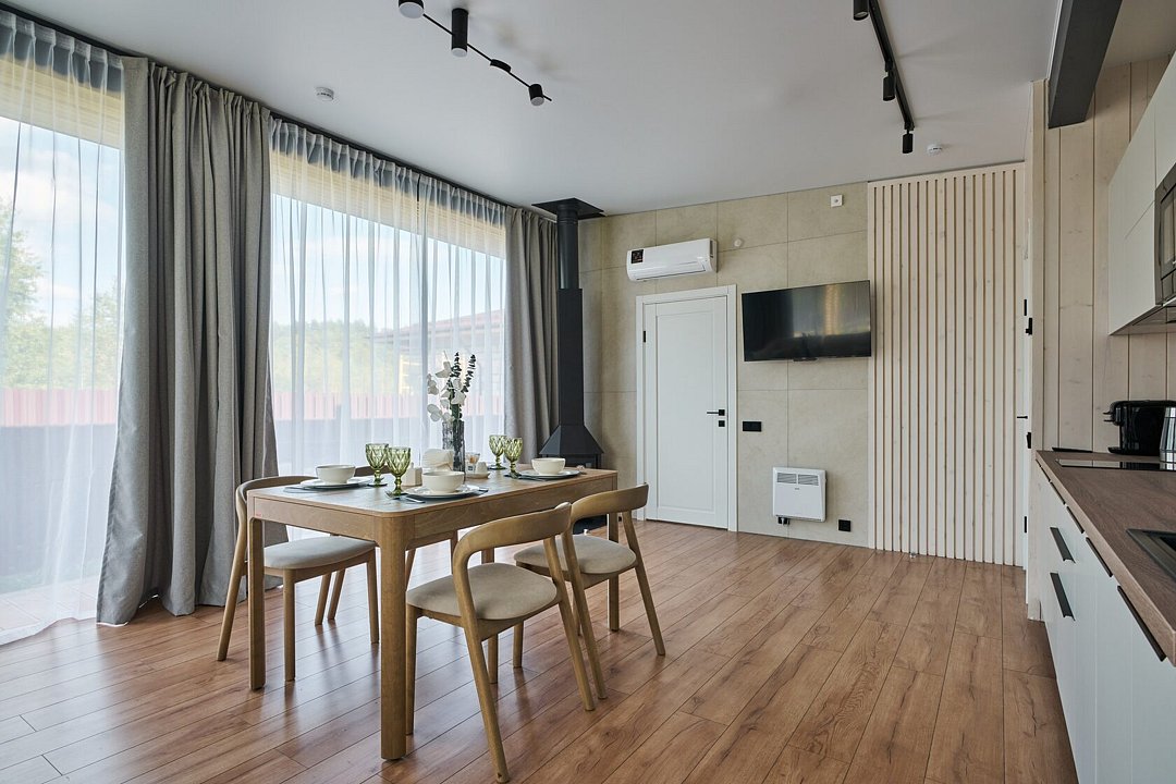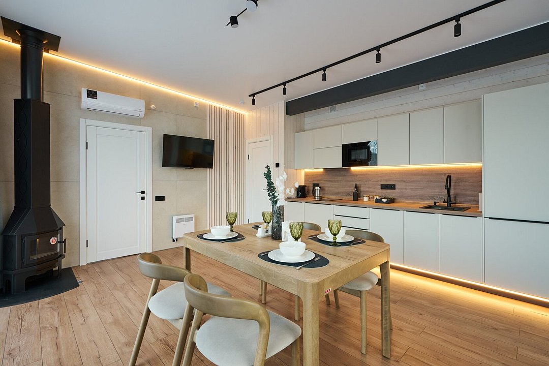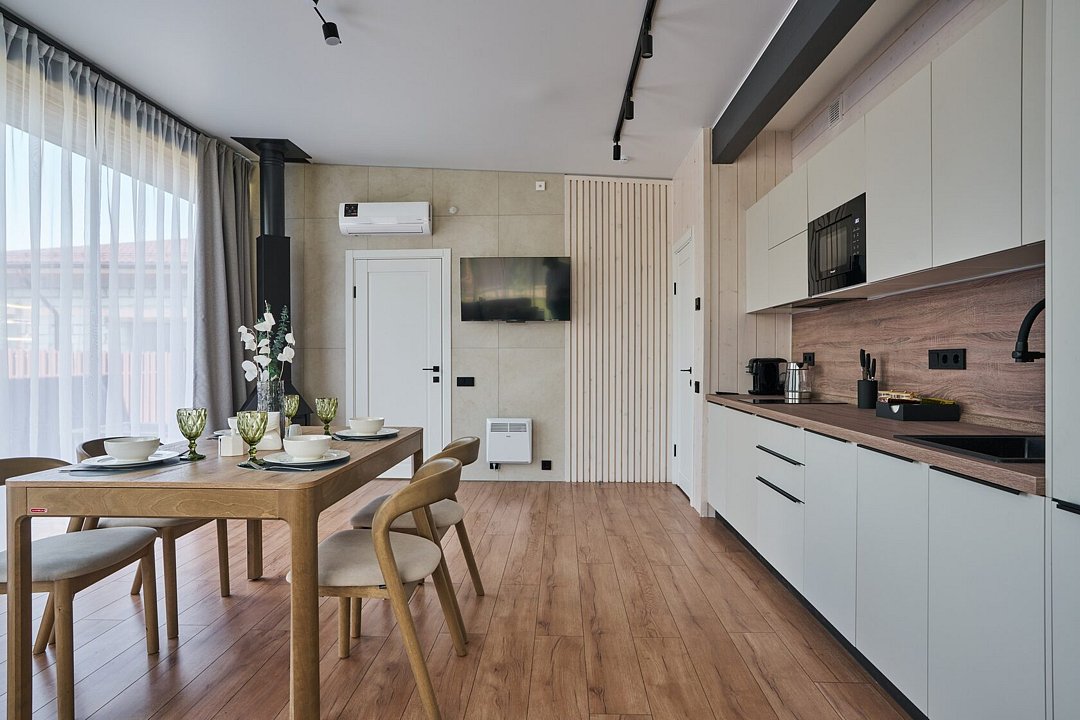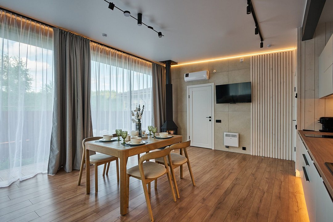 Интерьер выполнен в современном стиле, сочетающем элегантность и функциональность. В доме три отдельные спальни, кухня-гостиная с мягкой мебелью и диван-кроватью, современный санузел с ванной и большая открытая терраса с живописным видом на окрестности. Здесь есть все необходимое для комфортного проживания: удобная мебель, бытовая техника, полный комплект посуды, свежие постельные принадлежности и банные принадлежности высокого качества.