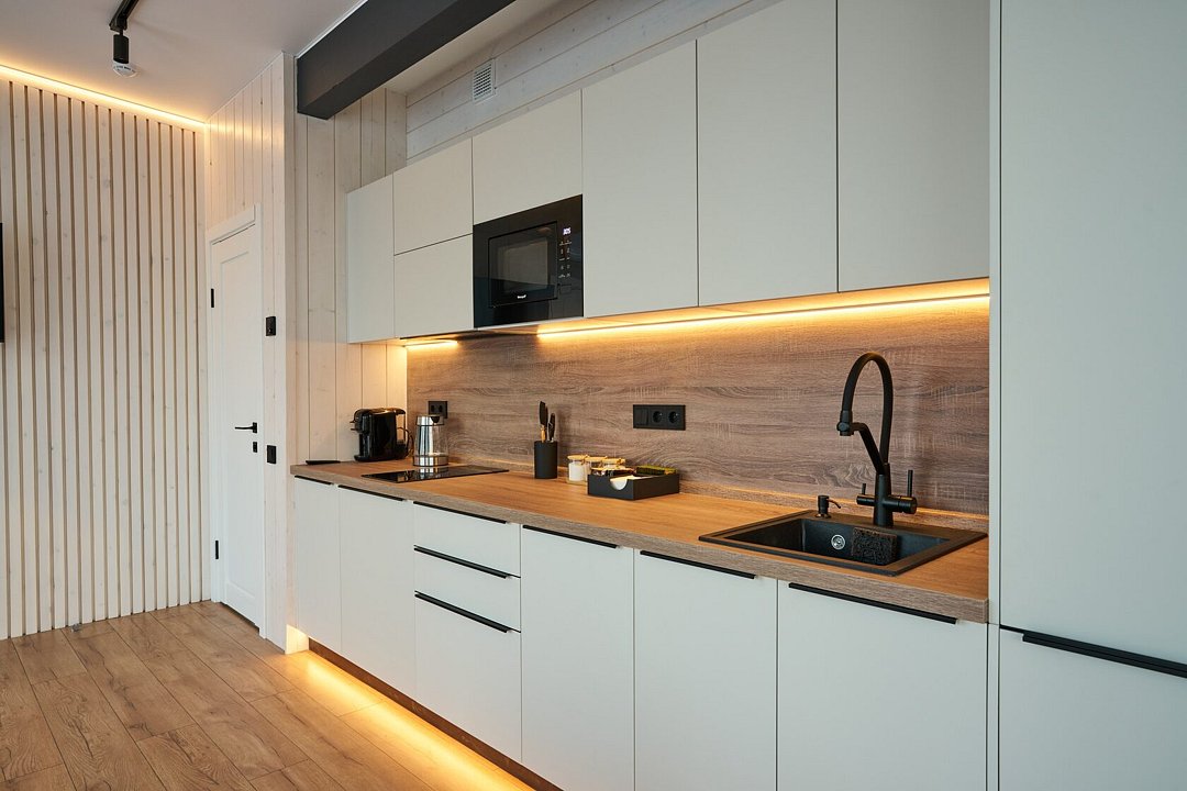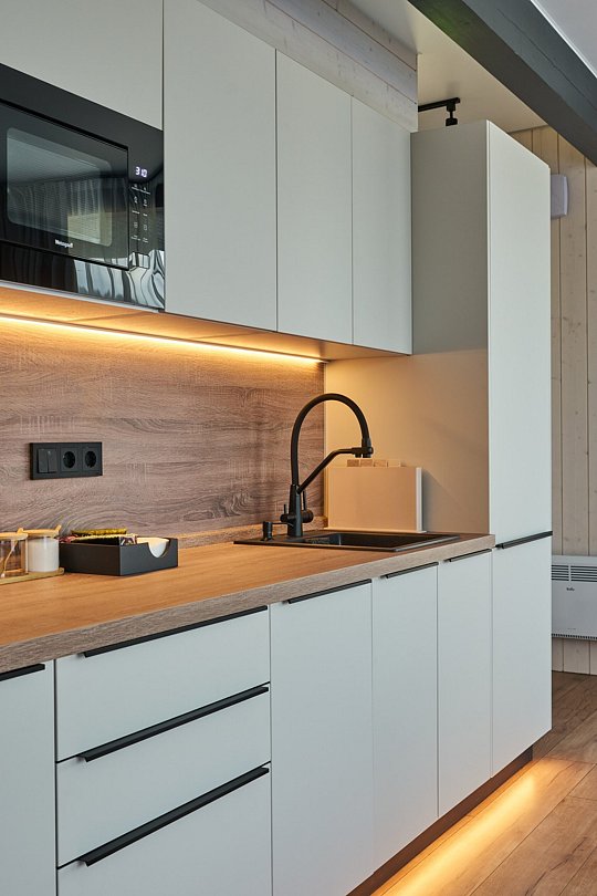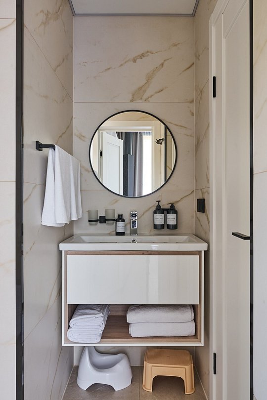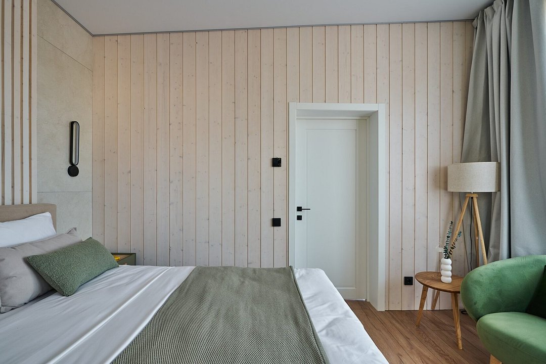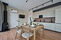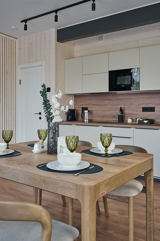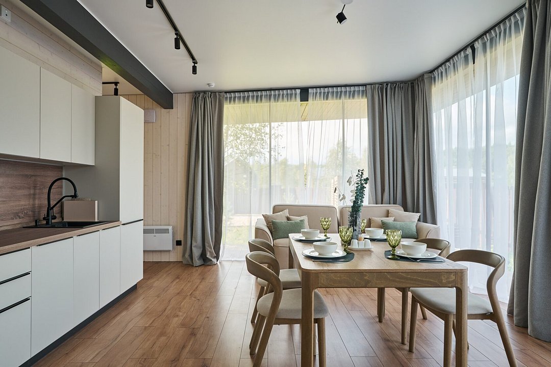 Интерьер выполнен в современном стиле, сочетающем элегантность и функциональность. В доме три отдельные спальни, кухня-гостиная с мягкой мебелью и диван-кроватью, современный санузел с ванной и большая открытая терраса с живописным видом на окрестности. Здесь есть все необходимое для комфортного проживания: удобная мебель, бытовая техника, полный комплект посуды, свежие постельные принадлежности и банные принадлежности высокого качества.