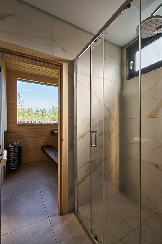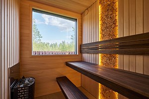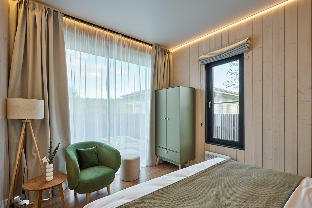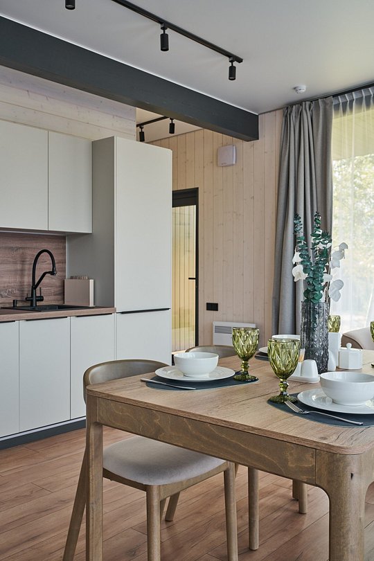 Внутри уютного домика гостей ждет отдельная спальня с удобной двуспальной кроватью, просторная гостиная, оборудованная большим диваном, а также сауна для релаксации. Кухня полностью оснащена необходимой посудой и техникой, а санузел оборудован душем. В домике предоставляются постельное белье, полотенца и мыло для вашего комфорта.