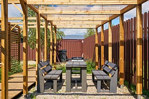 На территории есть индивидуальная зона для барбекю, где гости могут приготовить разнообразные блюда на открытом огне. Здесь установлены удобные скамейки, позволяющие комфортно расположиться за столом и наслаждаться свежим воздухом в компании друзей и близких.