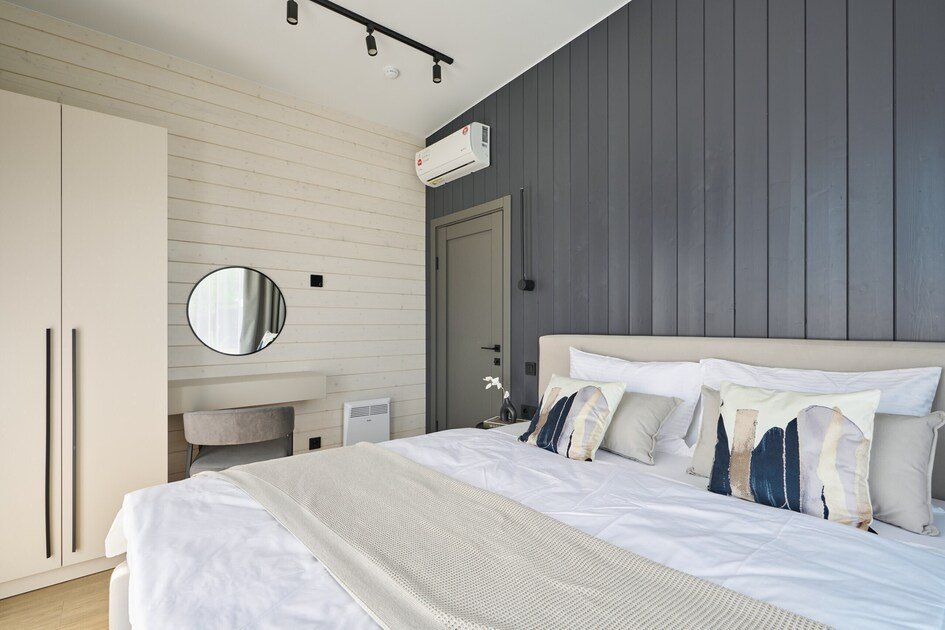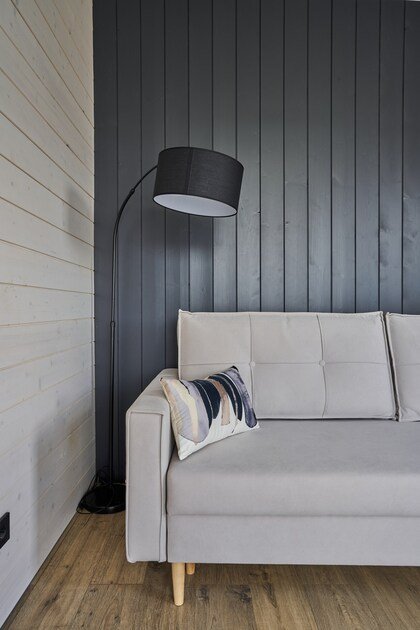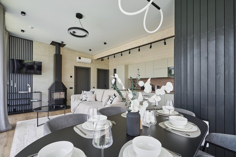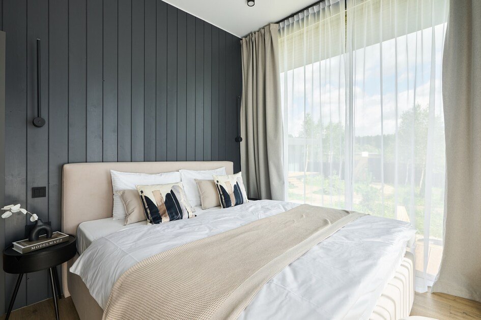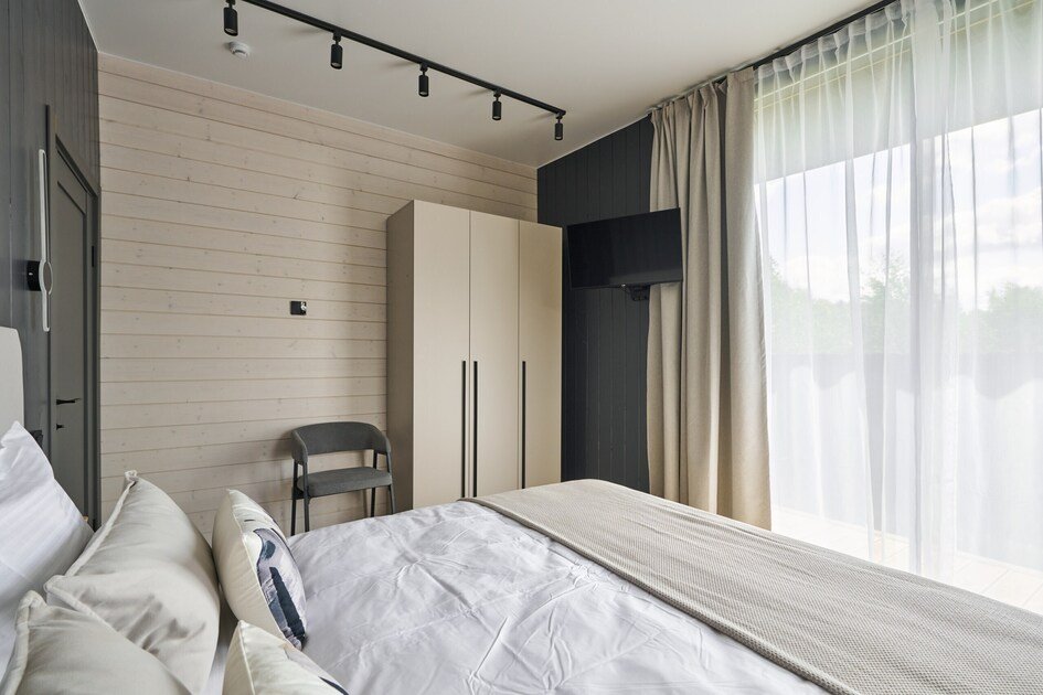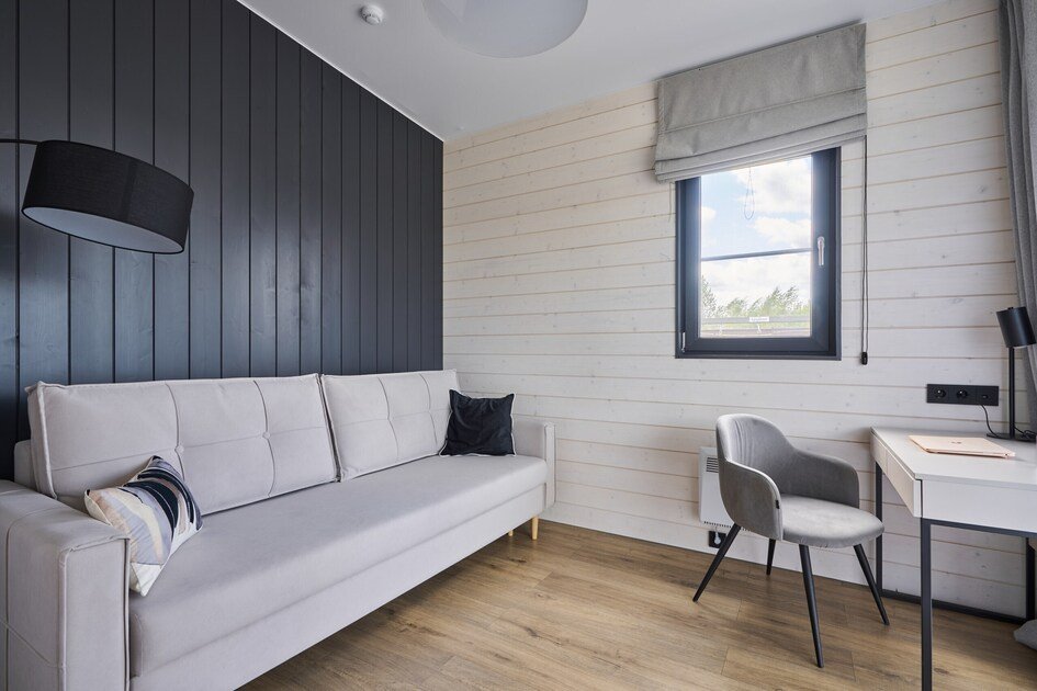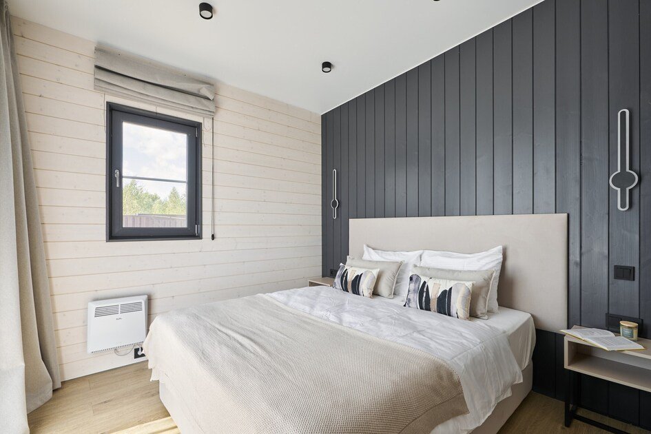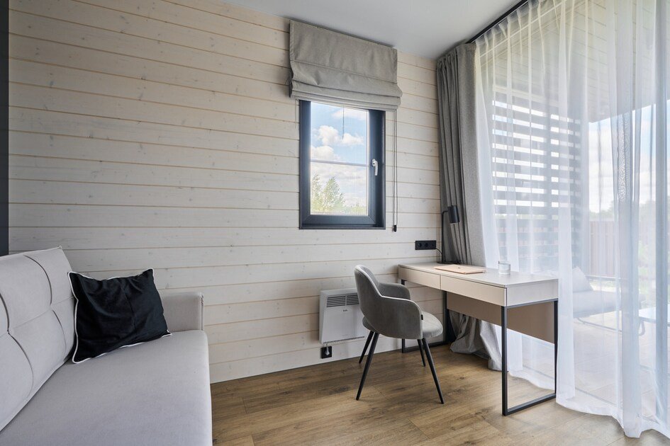 Светлый дом с панорамными окнами и сауной, расположенный рядом с деревней Бекетово. Внутри вас ждут три отдельные спальни с односпальными кроватями, которые можно легко сдвинуть в двуспальные.